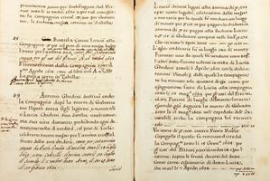 Manoscritto cartaceo di 54 cc., altre 20 almeno bianche, redatto da una sola mano per conto del Cardinal Alderano Cybo (1613-1700), "Decano del Sacro Collegio e Protettore Vigilantissimo di detta Venerabile Compagnia", grande stemma del Cardinale in antiporta, qualche foglio lento, splendida legatura in vitello bruno con cornice a ferri dorati e ai piatti la raffigurazione della Madonna di Loreto che si erge sulla casa in volo, difetti e mancanze al dorso.