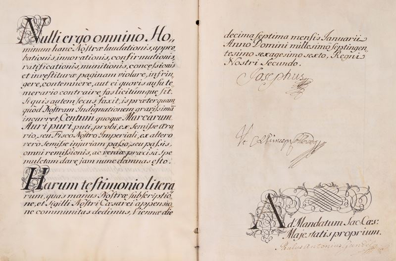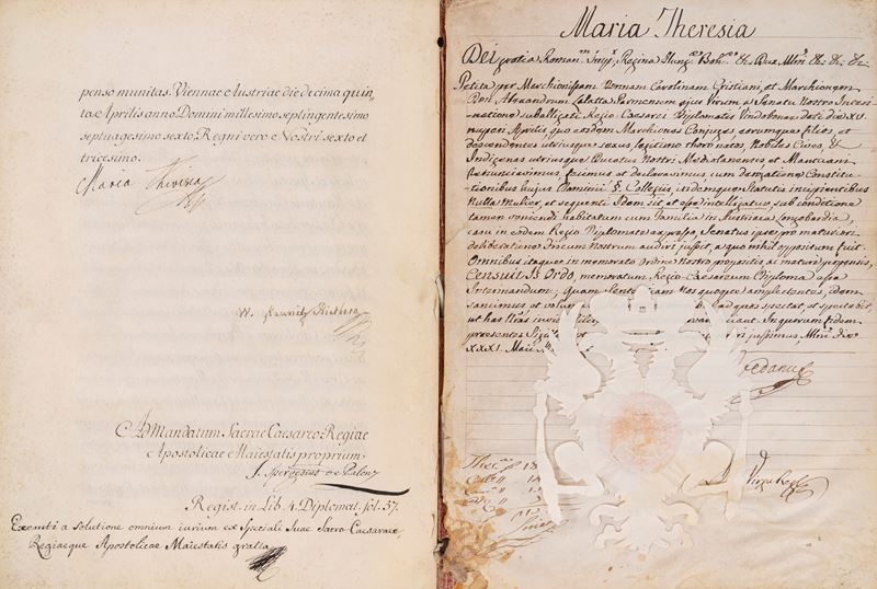 Concessione dell'Investitura del Feudo di Garoldo ad Adelaide Strozzi da parte dell'Imperatore Giuseppe II, 17 gennaio 1766, documento pergamenaceo di 10 fogli pergamenacei, 330 x 255 mm., in fine firma dell'Imperatore Josephus, il tutto raccolto entro un legatura in velluto cremisi - Diploma a favore della Marchesa Donna Carolina Cristiani e del Marchese Don Alessandro Lalatta, emesso da Mara Teresa figlia di Carlo VI Imperatore, Vienna 15 aprile 1776, con firma di Maria Teresa, 6 fogli pergamenacei, il tutto raccolto entro un legatura in velluto cremisi.