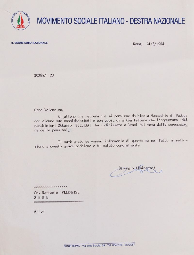 Lettera dattiloscritta firmata da Giorgio Almirante su carta intestata Movimento Sociale Italiano-Destra Nazionale, datata Roma 21/5/1984, indirizzata all'Onorevole Raffaele Valensise, 280 x 220 mm.