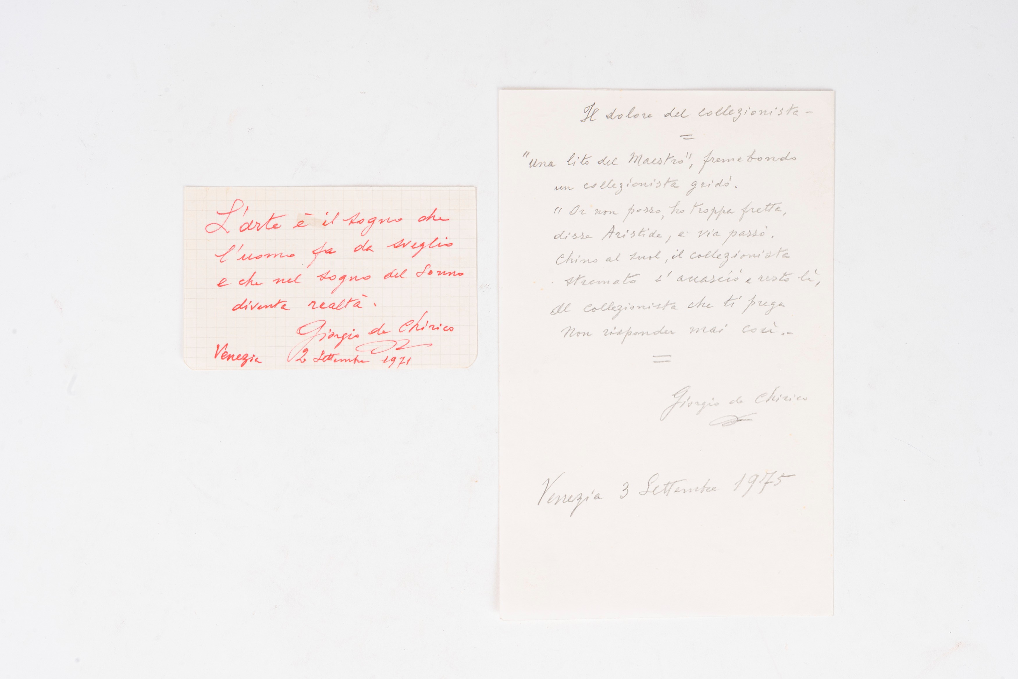 Nel lotto si alternano "comunicazioni di servizio" per il suo fidato gallerista e amico Zamberlan a interventi di grande spessore culturale e ideologico, un piccolo nucleo di documenti che andrebbe studiato, valorizzato e contestualizzato da parte di chi riconosce in De Chirico uno dei pilastri dell'arte moderna italiana.