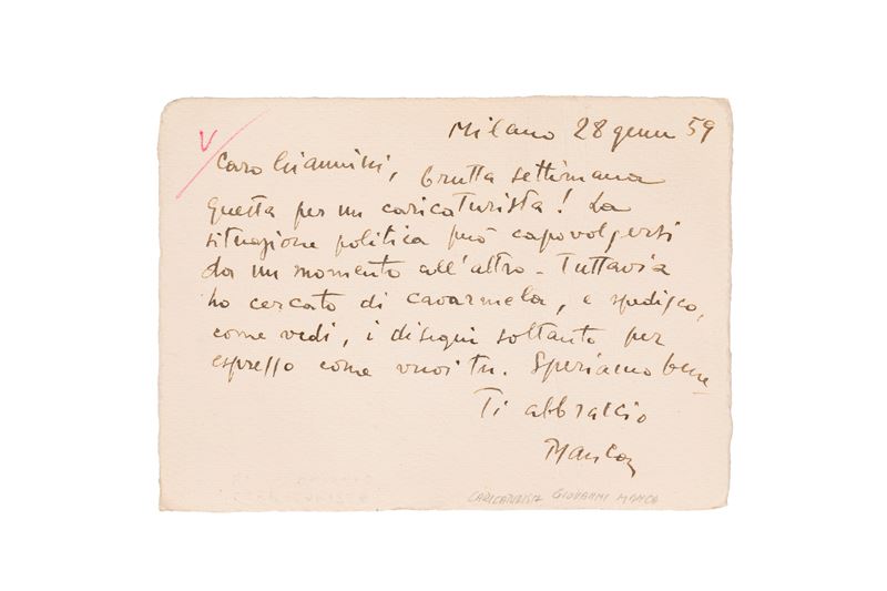 Caro Giannini, brutta settimana questa per un caricaturista! La situazione politica può capovolgersi da un momento all'altro. Tuttavia ho cercato di cavarmela, e spedisco, come vedi, i disegni soltanto per espresso come vuoi tu. Speriamo bene. Ti abbraccio. Manca".