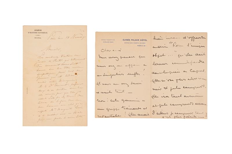 Due lettere rispettivamente di Lucien Guitry, celebre attore francese, su carta intestata del Palace Hotel Elysée, tre pp., 177 x 114 mm: la seconda di Edmond Perrier, celebre zoologo francese, su carta intestata del Museum d'Histoire Naturelle, datata 10 novembre 1911, due pagine, 207 x 133 mm.
