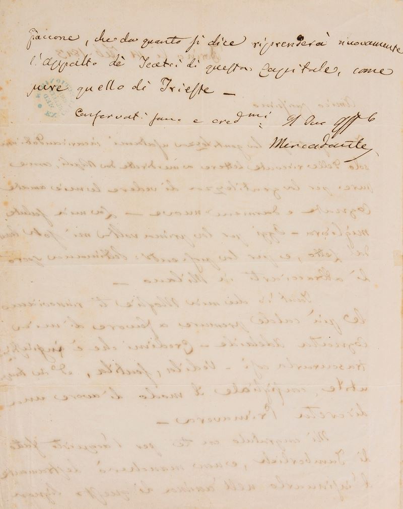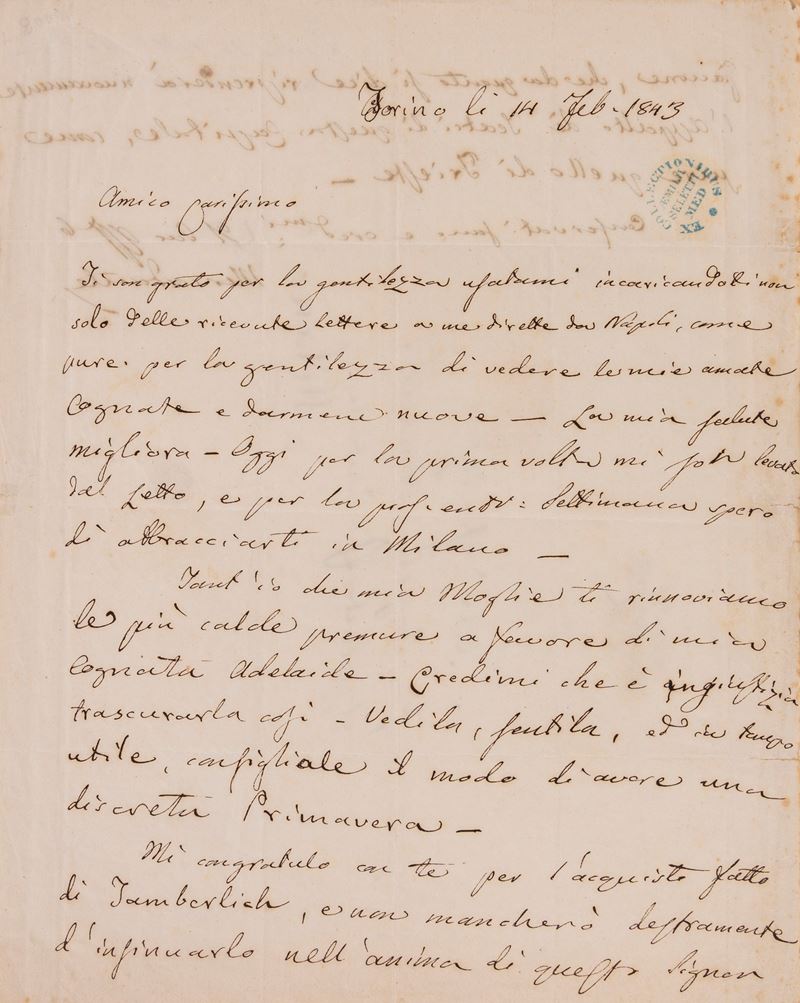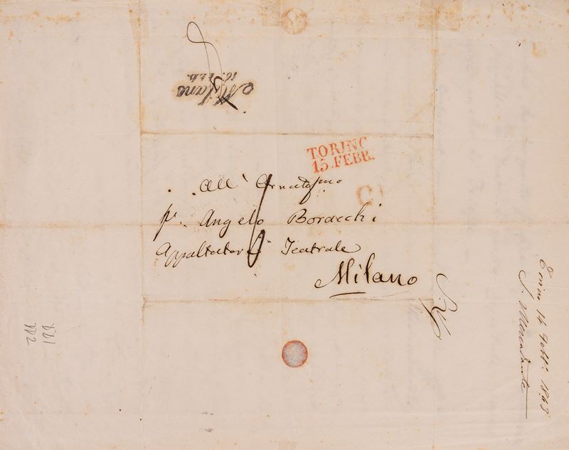 Bella lettera autografa firmata, 270 x 215 mm., indirizzata all'appaltatore teatrale Angelo Boracchi di Milano, datata Torino 14 febbraio 1843. Timbro di collezione privata in alto a destra.