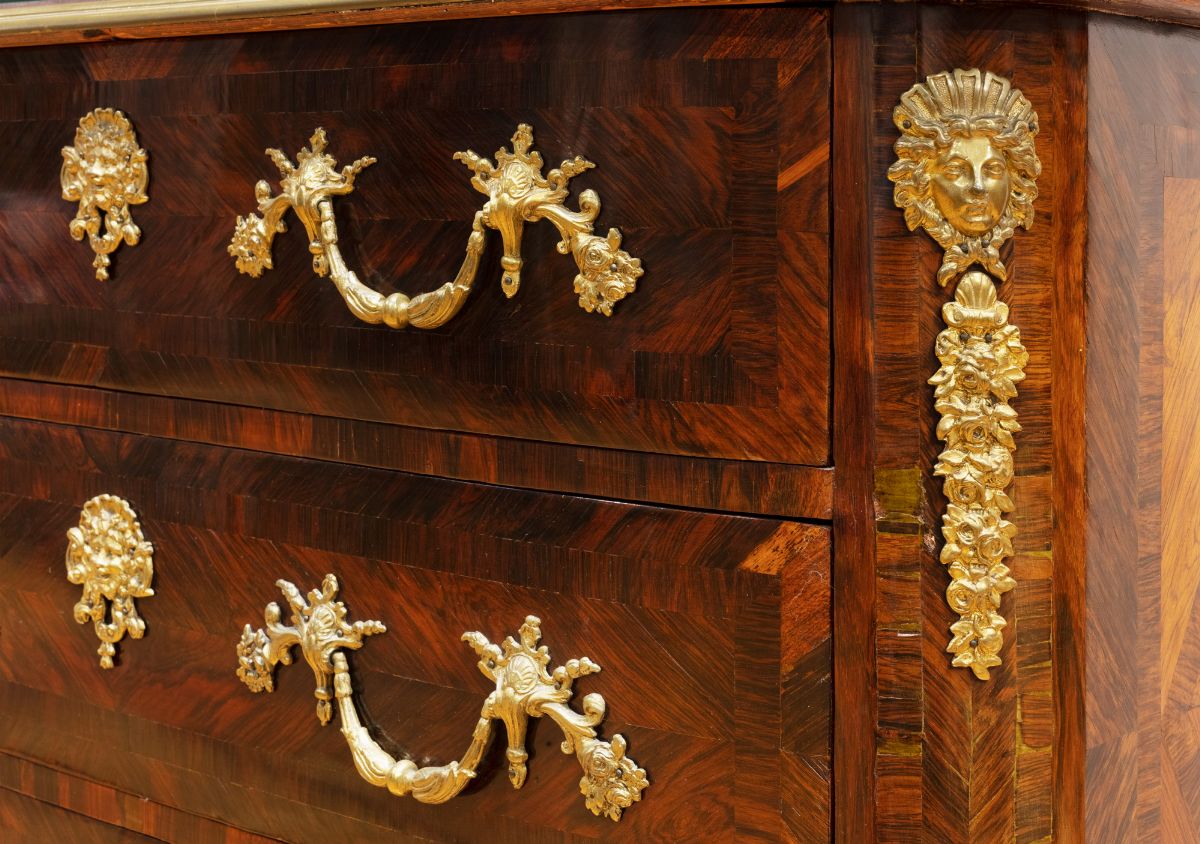piano rettangolare smussato agli angoli e chiuso da profili in bronzo dorato, tre cassetti con maniglie in bronzo, decorazioni bronzee con teste di Medusa agli angoli