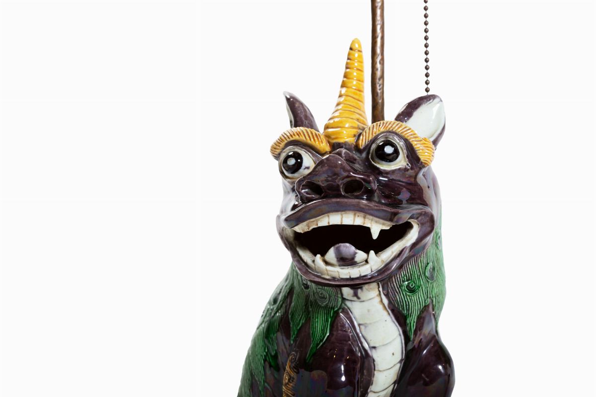Coppia di leoni fantastici in porcellana policroma, montati a lume, Cina secolo XIX, dinastia Qing