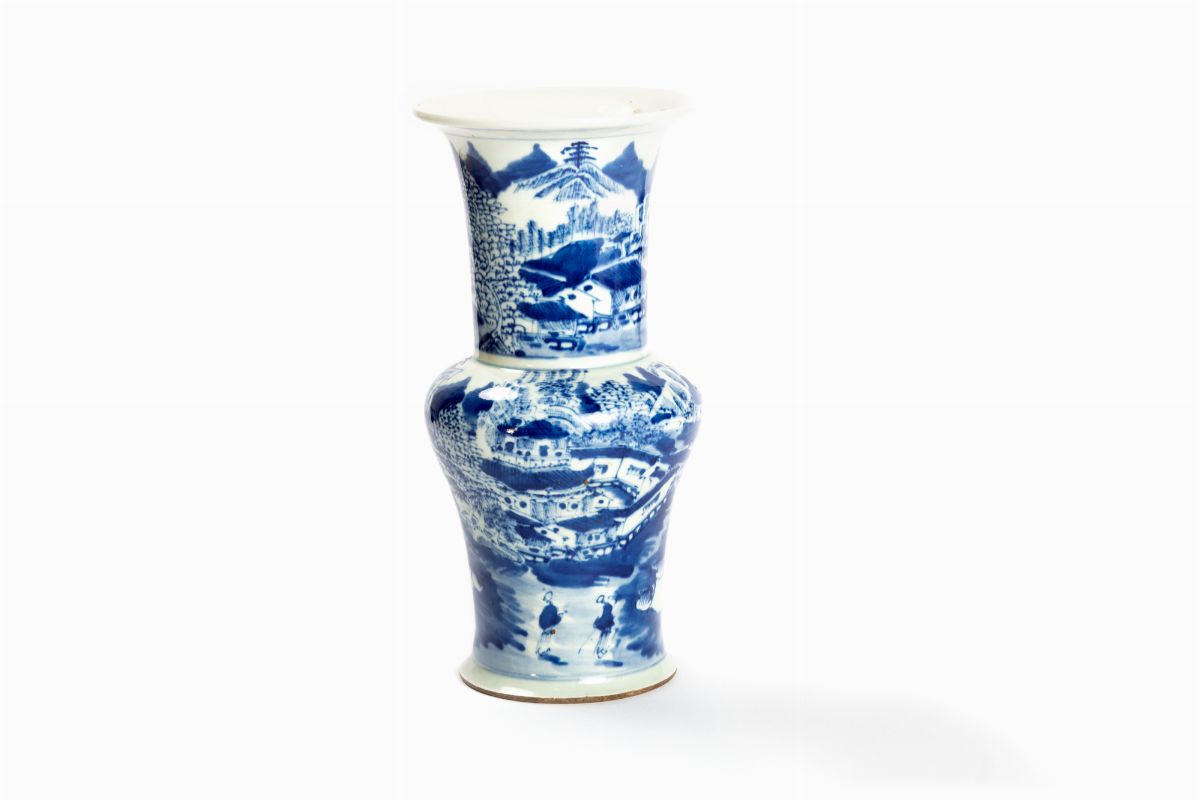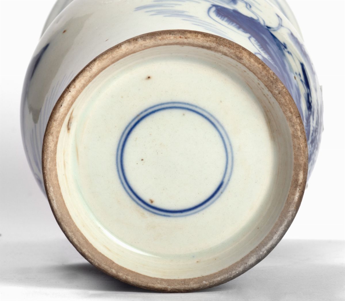 decorato con architetture, figure e alberi, marchio sotto la base con doppio cerchio in blu