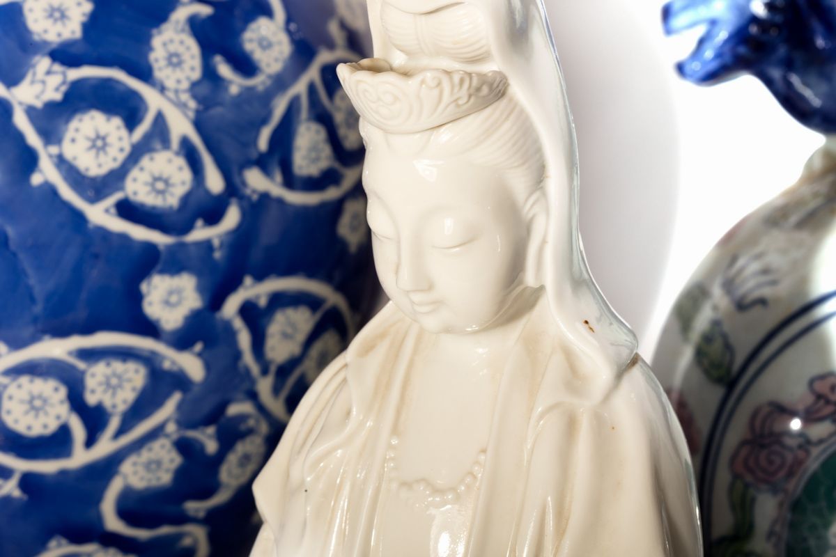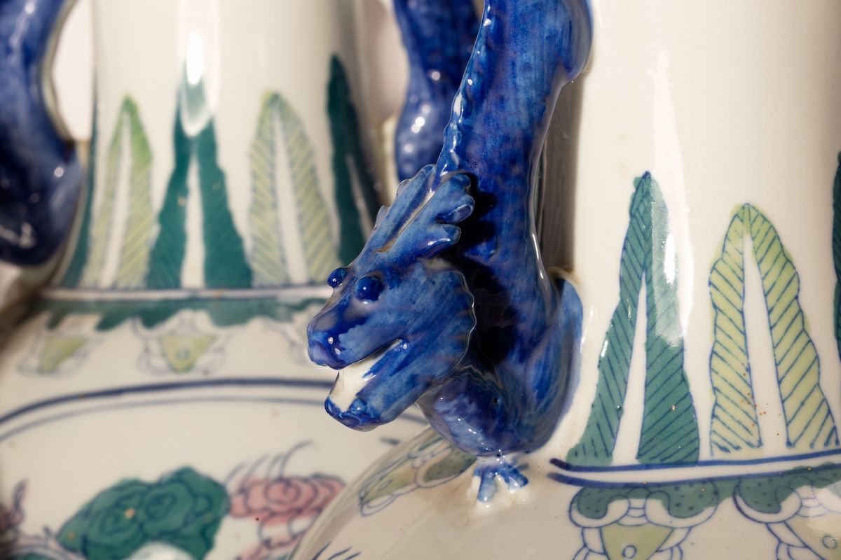 una coppia di vasi con dragoni; una potiche bianca e blu; una Guanyn in blanc de Chine; petit giardiniere con fiori e uccellini