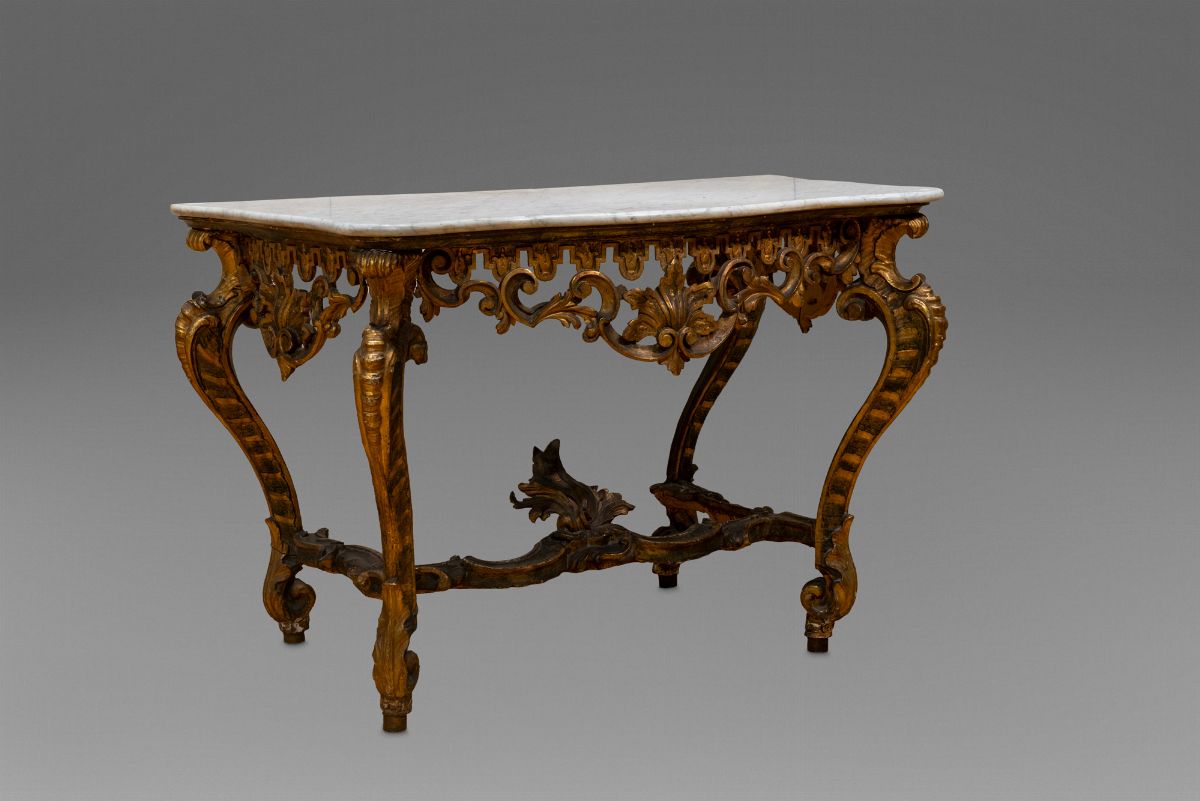 Consolle in legno intagliato, laccato e dorato, con piano in marmo bianco, secolo XVIII