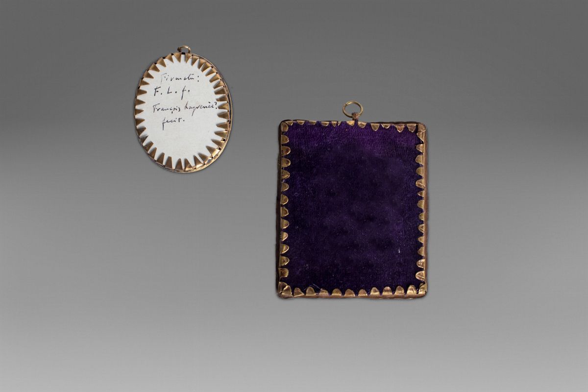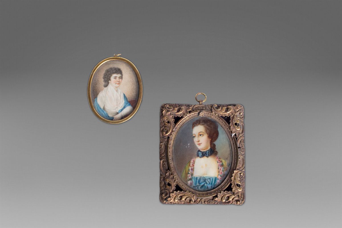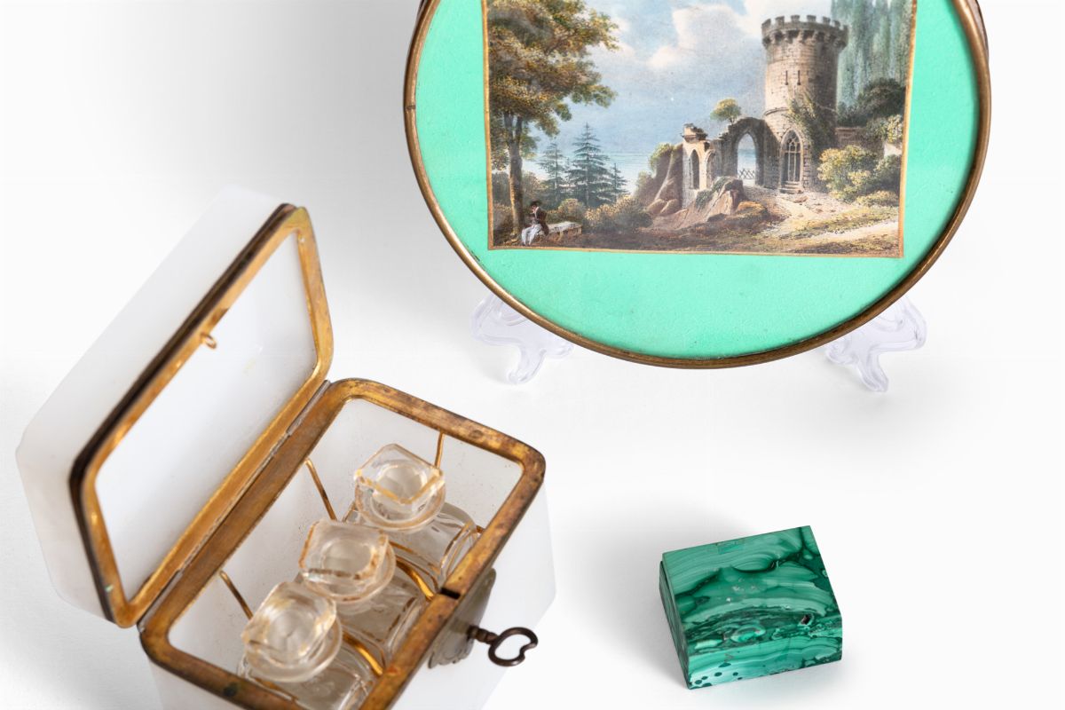 composto da un contenitore in opalina con tre flaconcini all'interno, una coppa con coperchio in metallo dorato, una scatolina in metallo e coperchio in cristallo, una scatolina ovale in tartaruga e profili in metallo dorato, una scatola circolare con stampa con rovine gotiche sul coperchio, una scatola in cartone con stampa raffigurante scena familiare sul coperchio, una chiave in bronzo dorato, una scatolina in malachite, una miniatura ovale raffigurante ritratto di gentildonna, secolo XIX, una miniatura rettangolare raffigurante ritratto di gentildonna con papillon azzurro, inizi secolo XX.