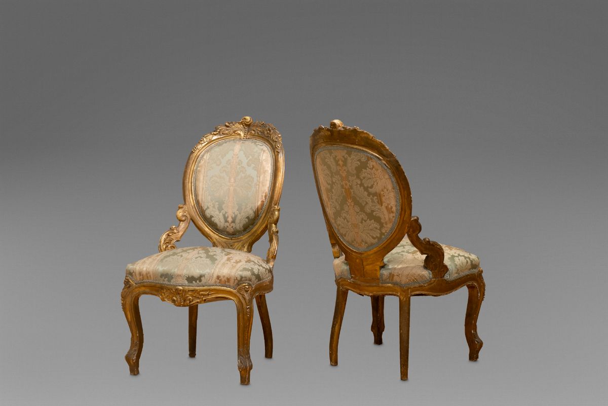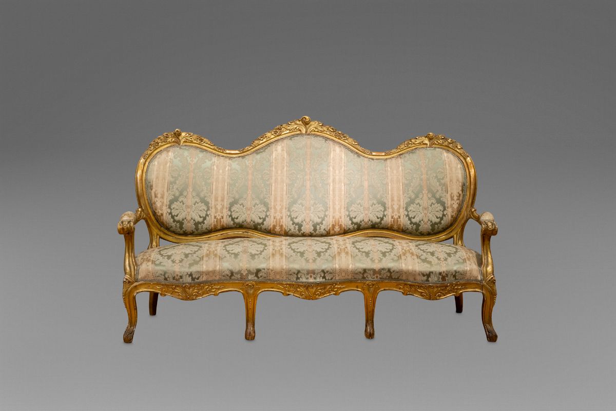 Otto poltroncine e un divano a tre posti in legno intagliato e dorato, a motivi vegetali e volute, XIX secolo
