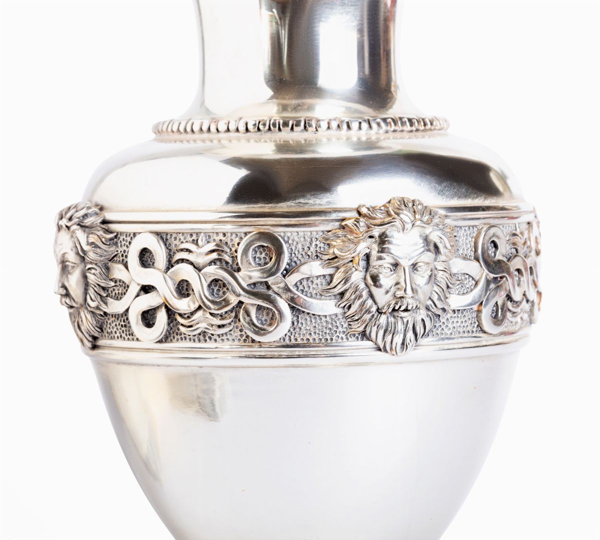 a corpo liscio ornato al centro da fascia con mascheroni e decorazione spiraliforme