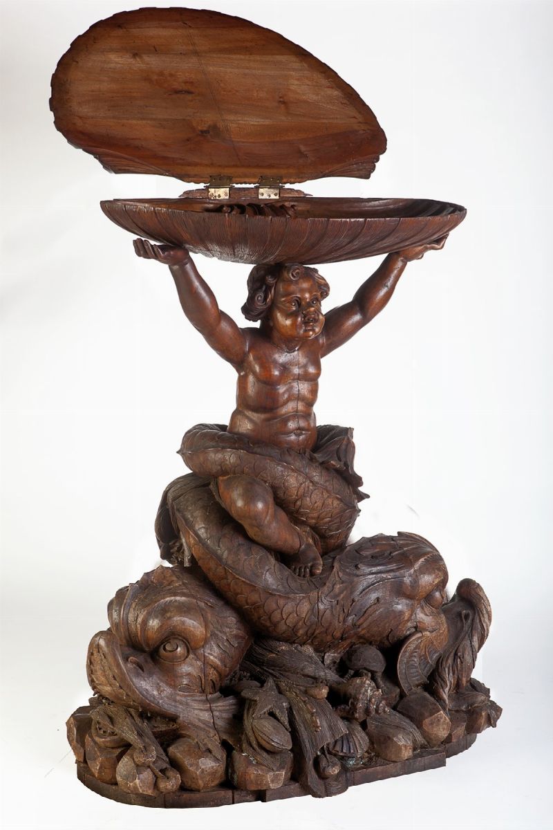 Fioriera da parata in legno scolpito, intagliato e laccato con putto reggi conchiglia avvolto entro due delfini, la base con decori marini (difetti), fine secolo XIX