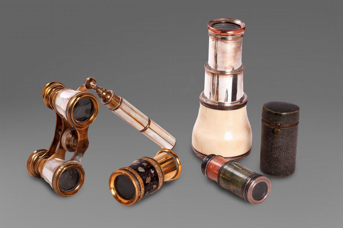 Lotto di 4 binocoli da teatro, uno in galuchat con astuccio, uno in madreperla, uno in avorio, uno in smalto nero e inserti in madreperla
