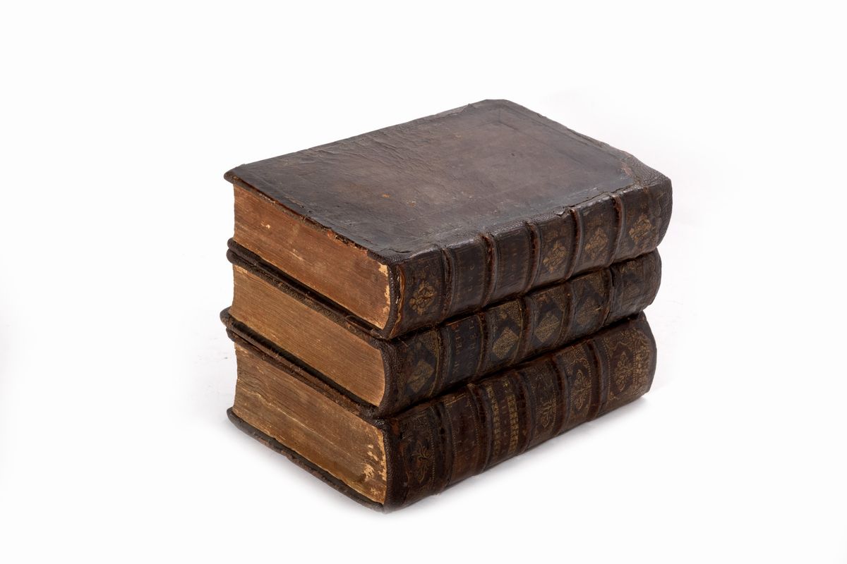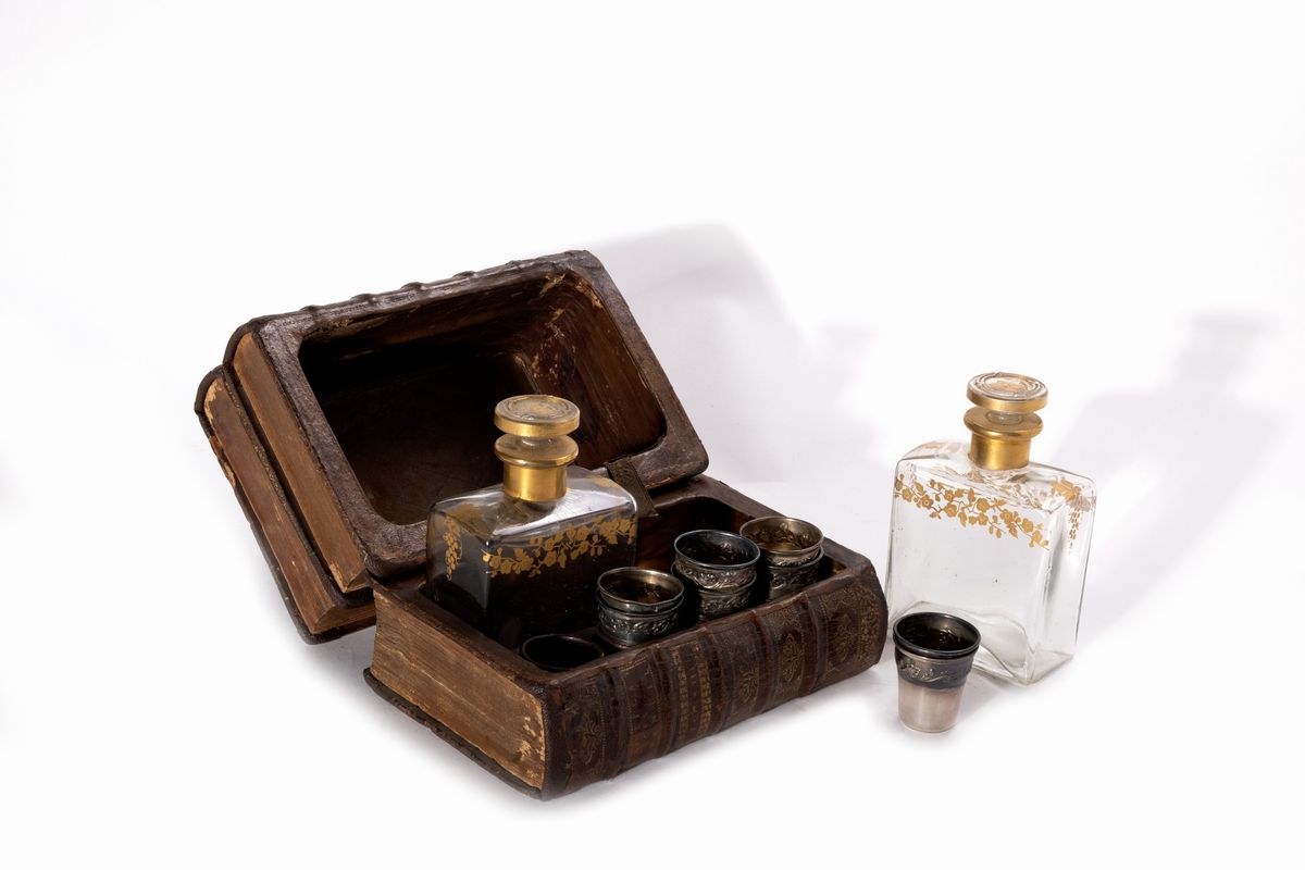 Contenitore a forma di libro con all'interno due fiaschette in vetro con decori in oro, e otto bicchierini in argento, secolo XIX