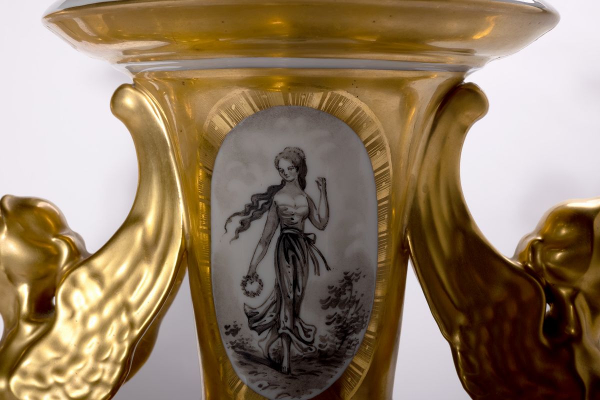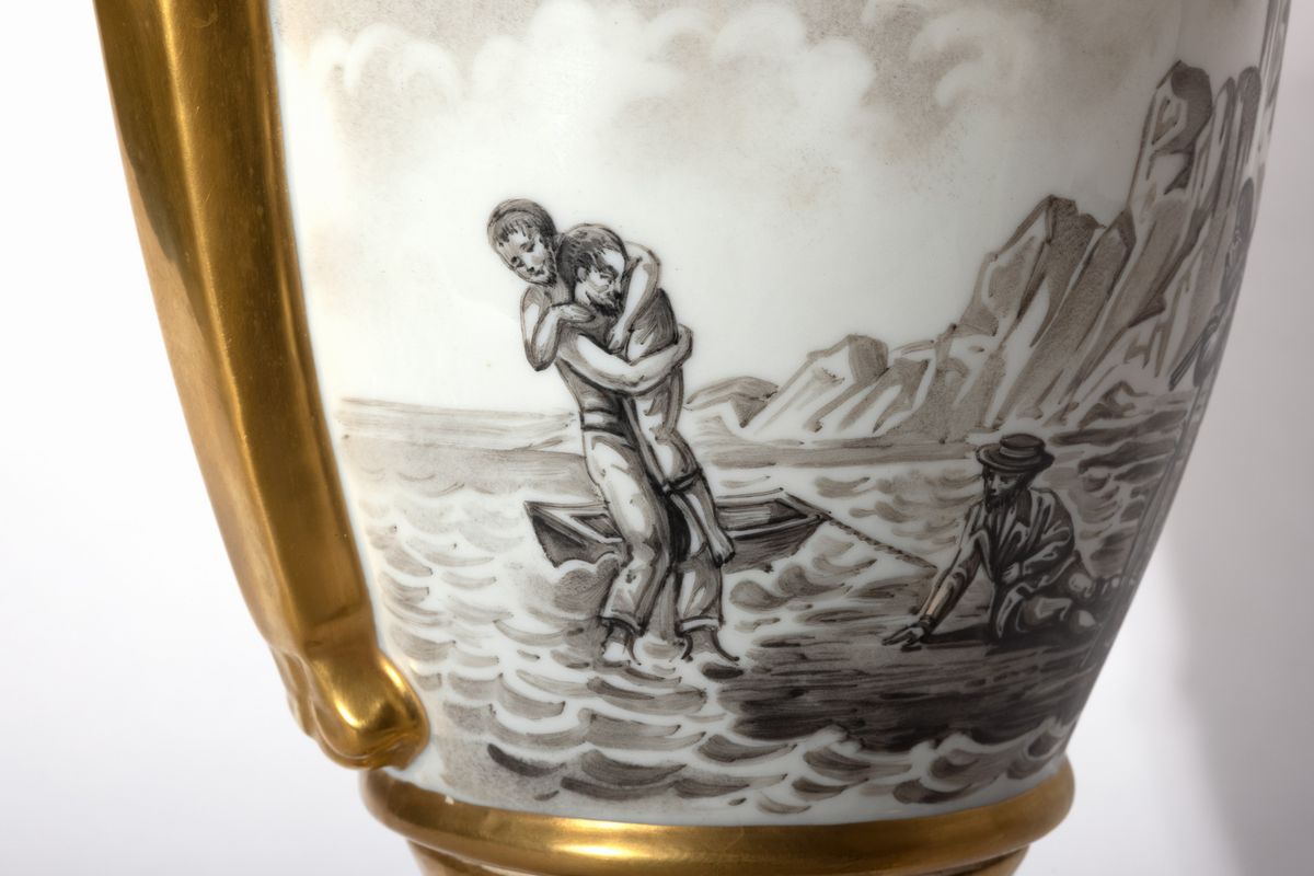 Coppia di vasi in porcellana bianca e oro, dipinti in bianco e nero con scene dal Robinson Crusoe di Daniel Defoe, Francia, fine secolo XIX -inizi secolo XX