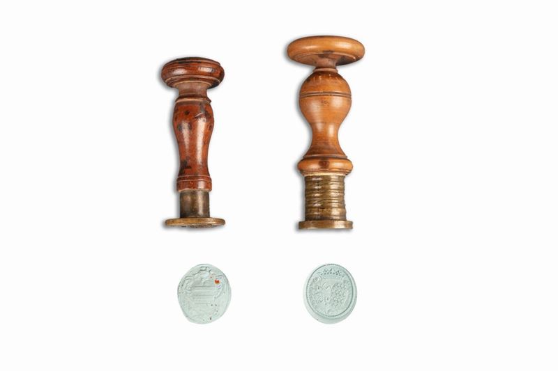 Due sigilli in bronzo: uno con manico in ferro, uno con Cupido, entrambi con stemmi nobiliari,...