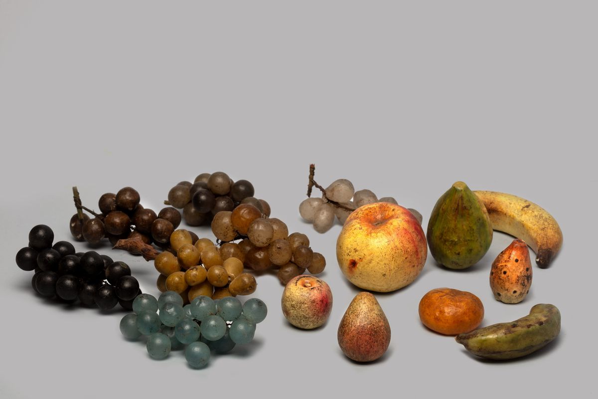 Lotto composto da 21 frutti e ortaggi in cera e materiali vari e un cestino con frutta e ortaggi da presepe, Napoli secolo XIX