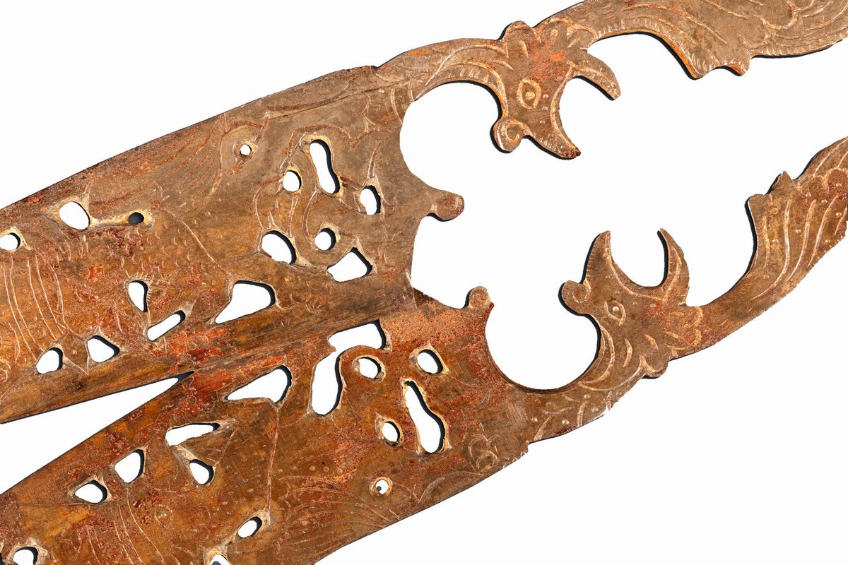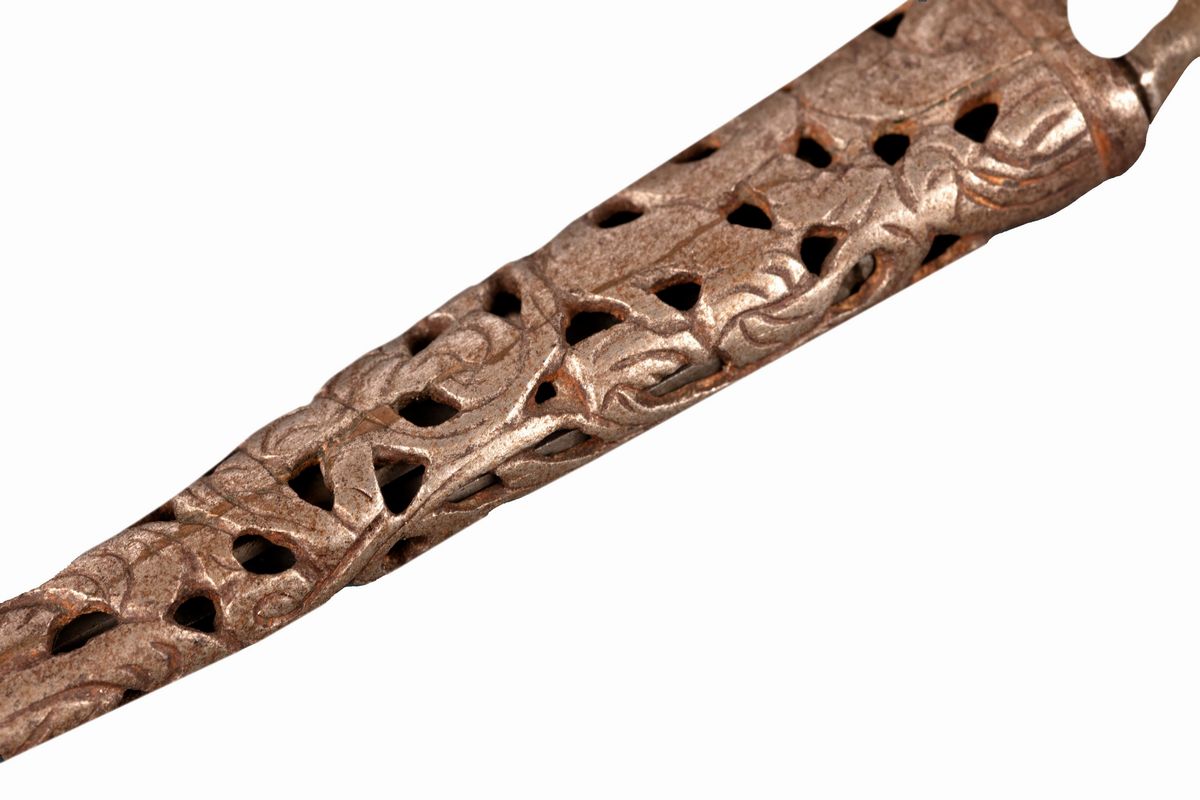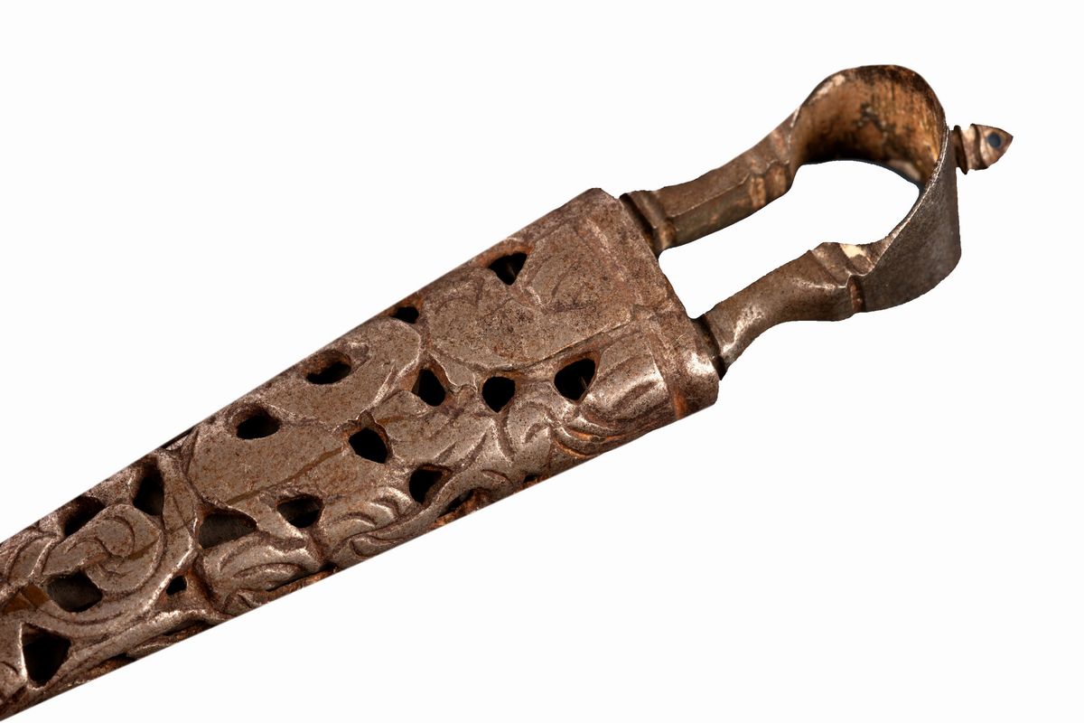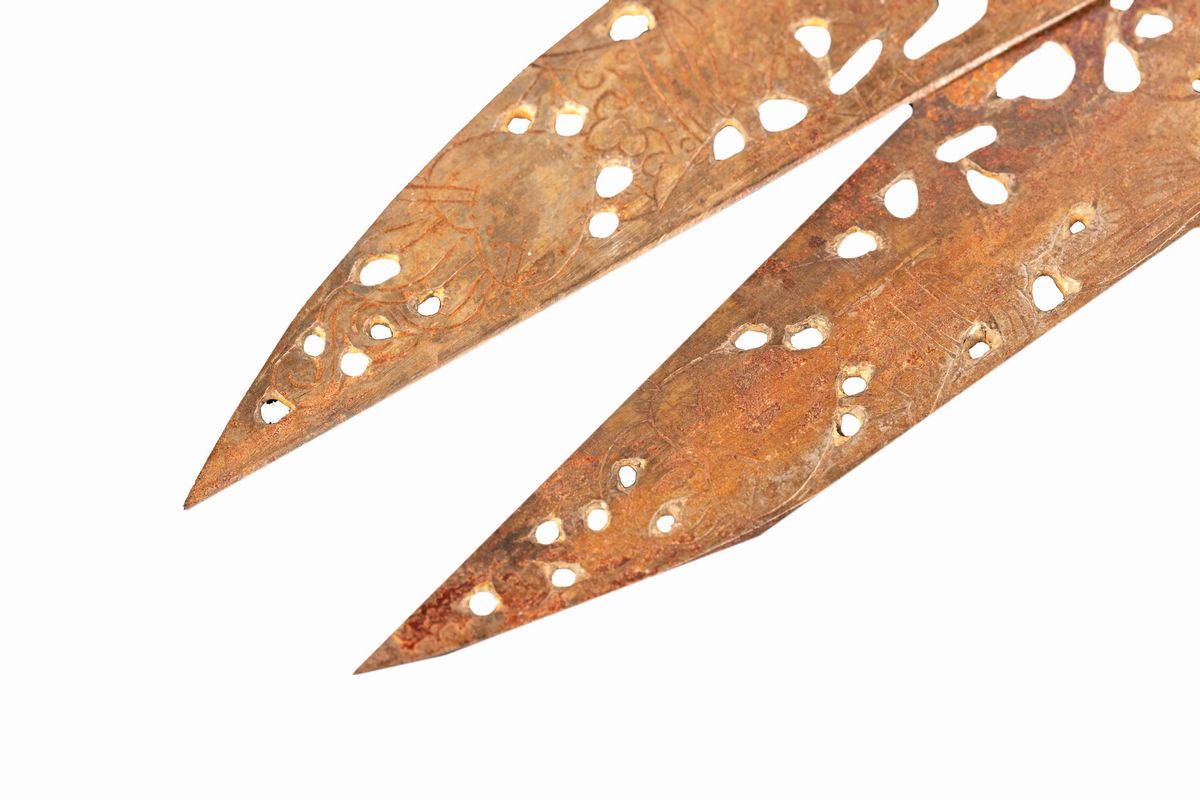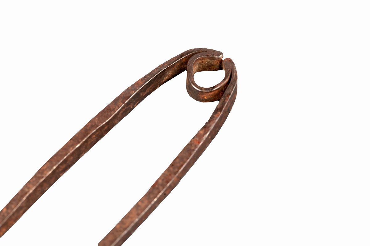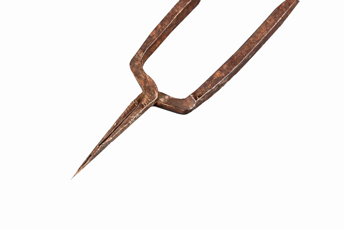 la forbice più grande incisa con grifoni coronati e cuori trafitti da frecce; la forbice più piccola entro custodia in ferro traforato a motivi fitomorfi