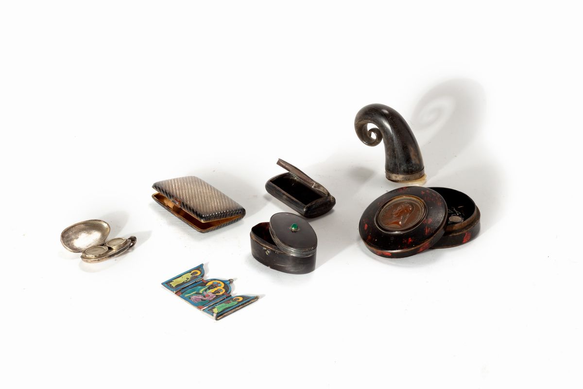 una scatola in papier - maché con effigie di Dante; una ovale in tartaruga; un corno porta polvere; tre scatoline in argento; una miniatura in argento e smalti policromi