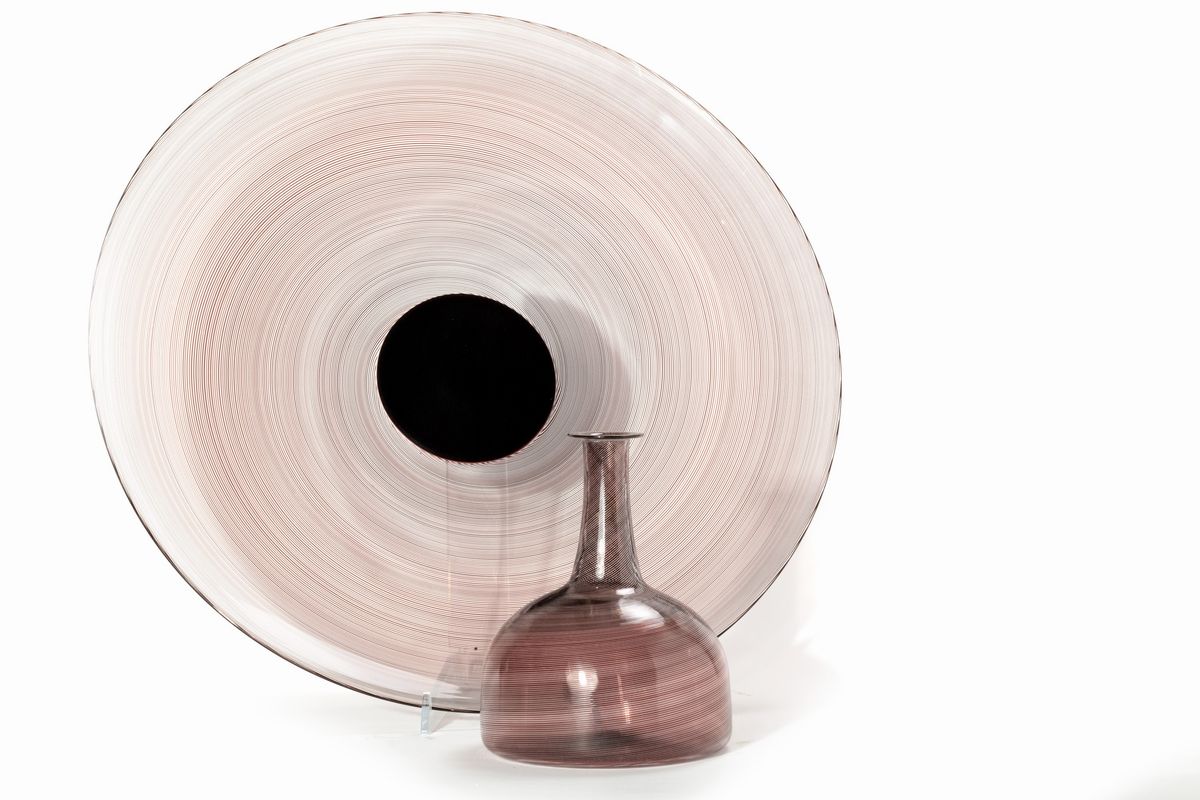 Lotto composto da un grande piatto e una bottiglia in vetro fumé rigato, Venini