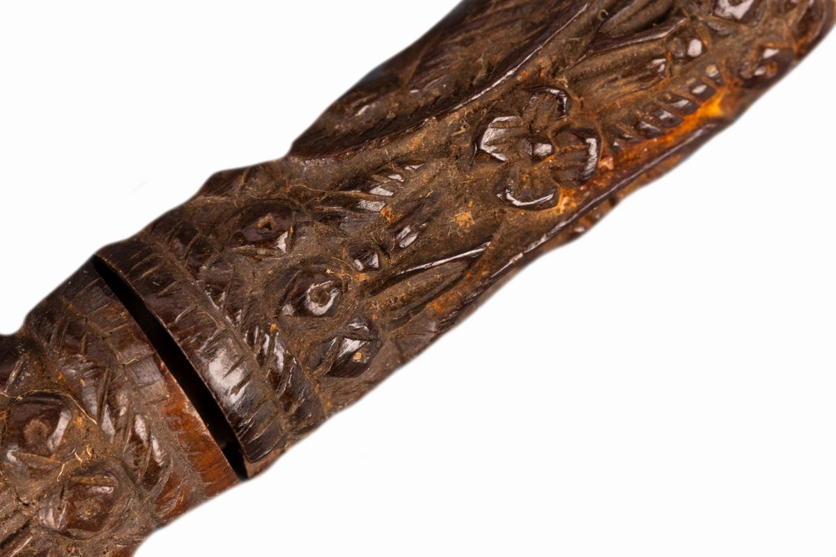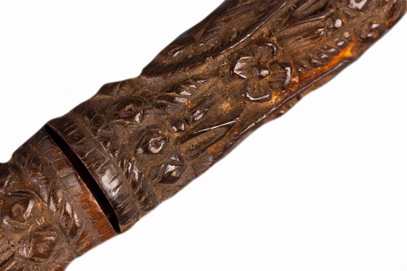 uno in bosso intagliato con profili e motivi vegetali; l'altro in ferro inciso a motivi geometrici