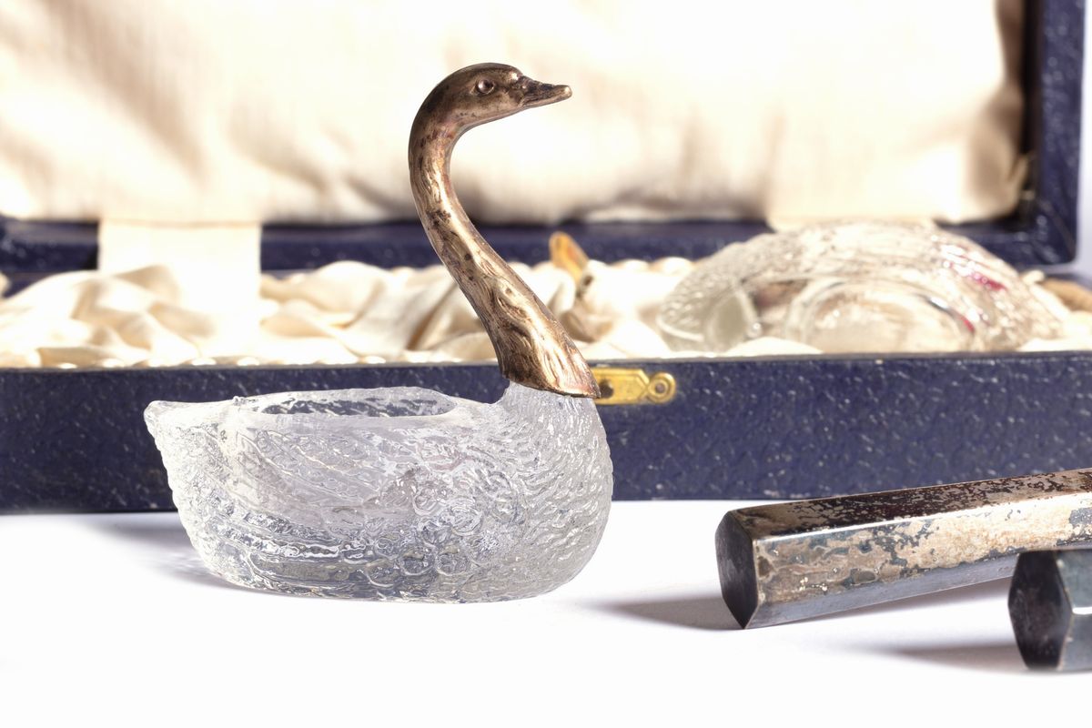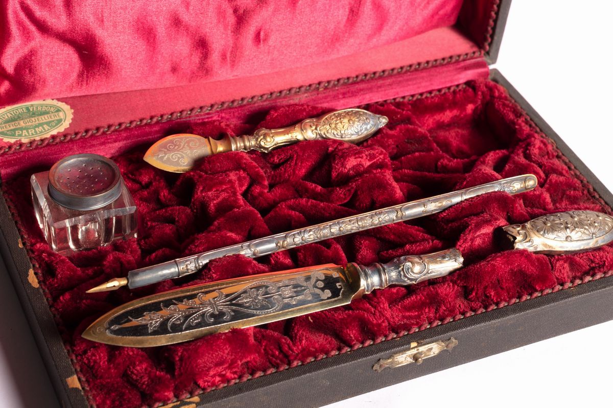 Lotto composto da tre astucci contenenti un servizio da scrittura, un servizio da picnic e un set sale e pepe, secoli XIX - XX