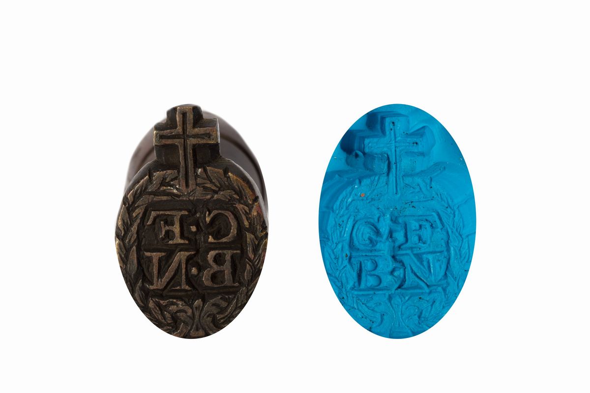 Lotto composto da tre sigilli in bronzo, con manici in legno tornito, secolo XIX