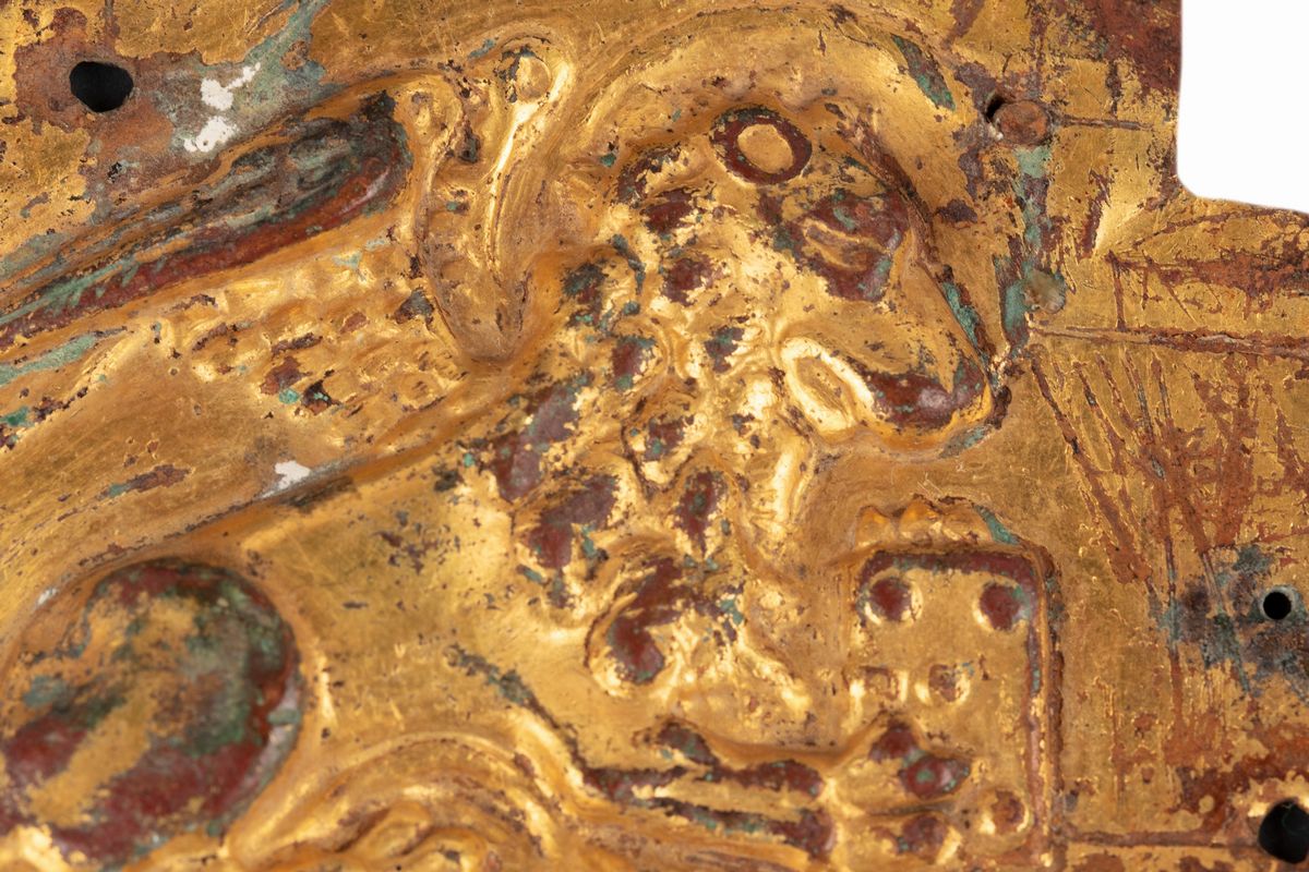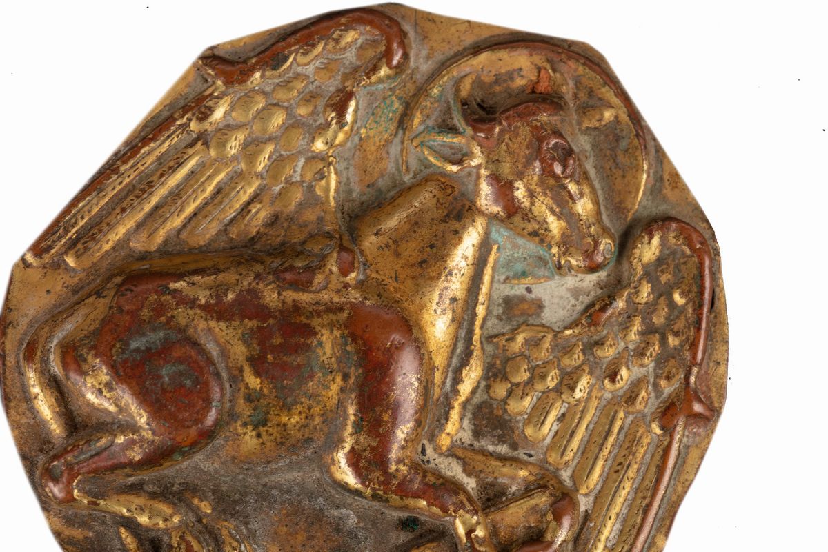 Lotto di cinque finimenti per croci processionali in lamina di rame sbalzato, cesellato e dorato con i simboli del Tetramorfo, secoli XIV - XV