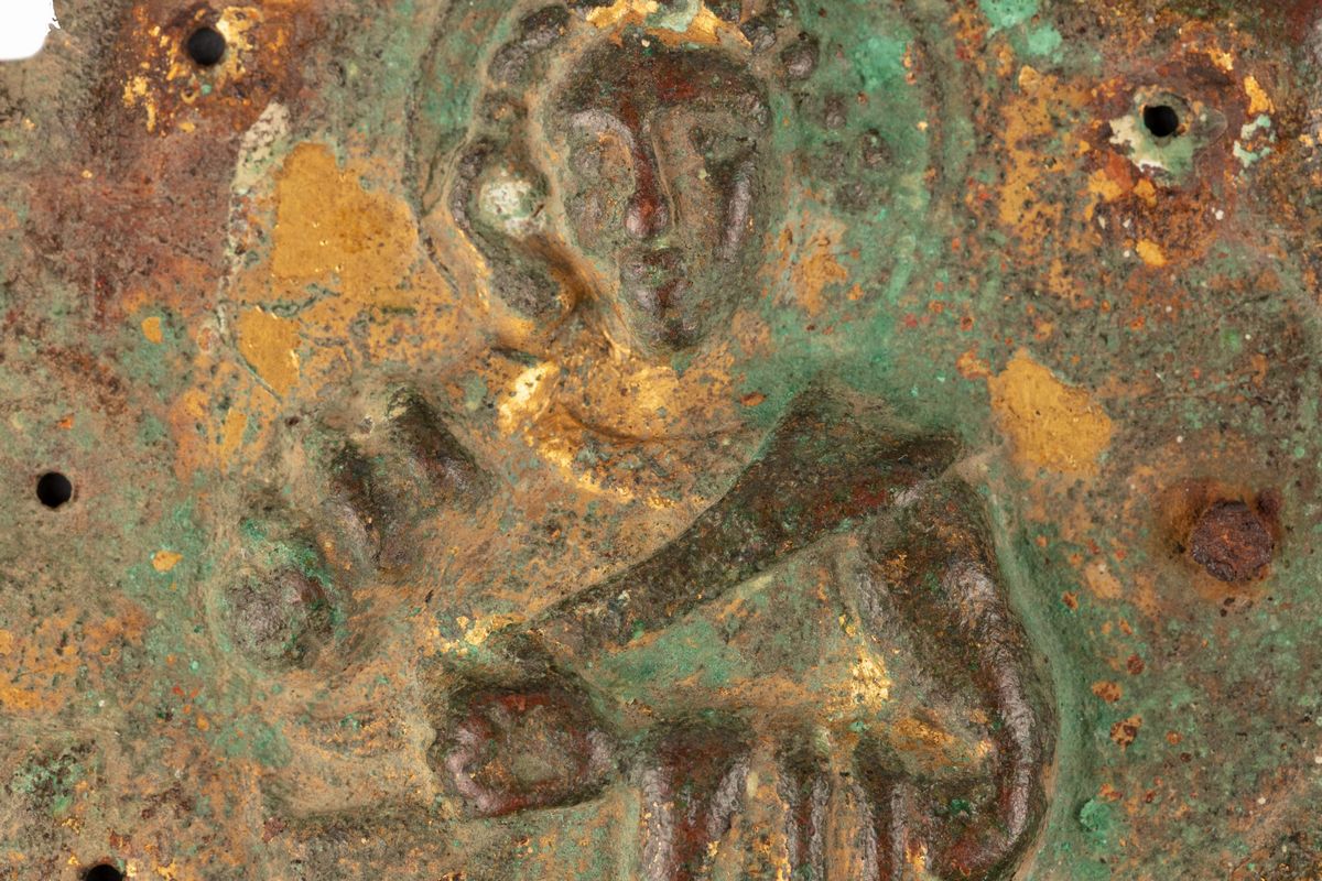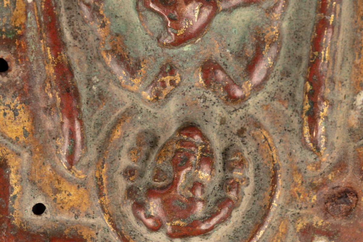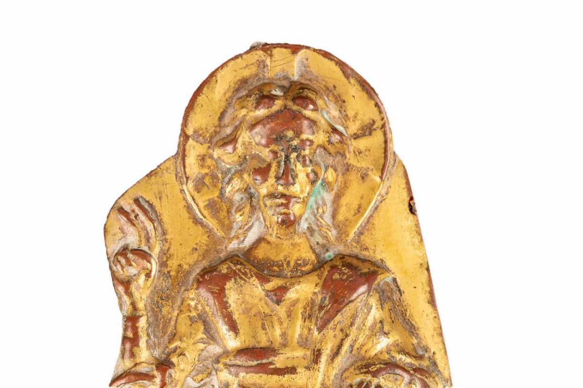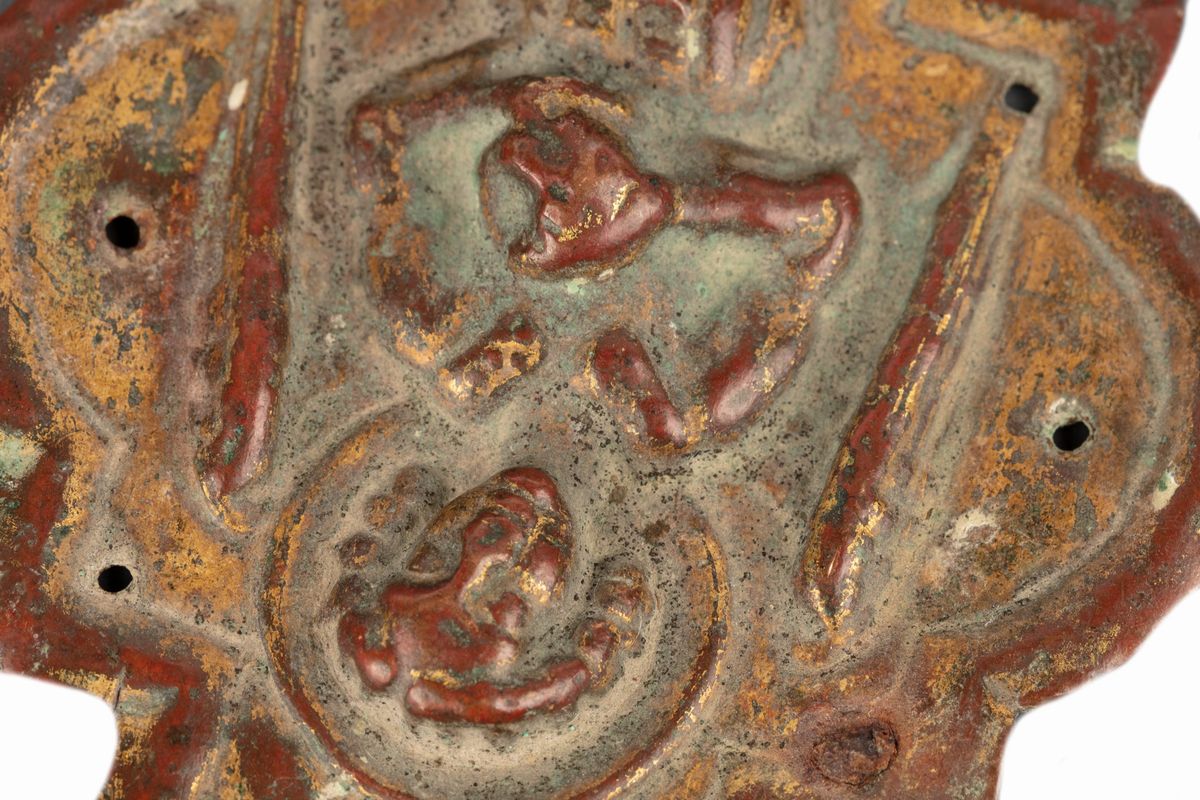 Lotto di cinque finimenti per croci processionali in lamina di rame sbalzato, cesellato e dorato, secoli XIII - XIV