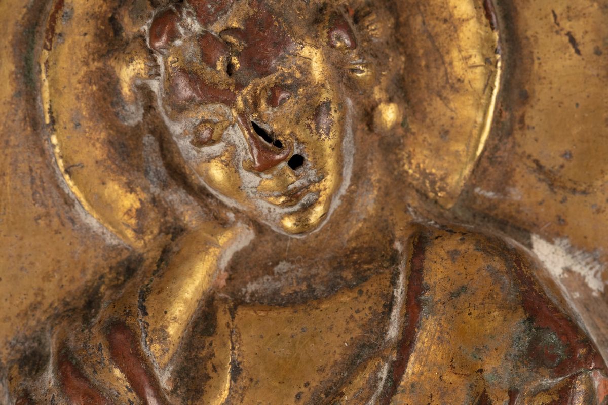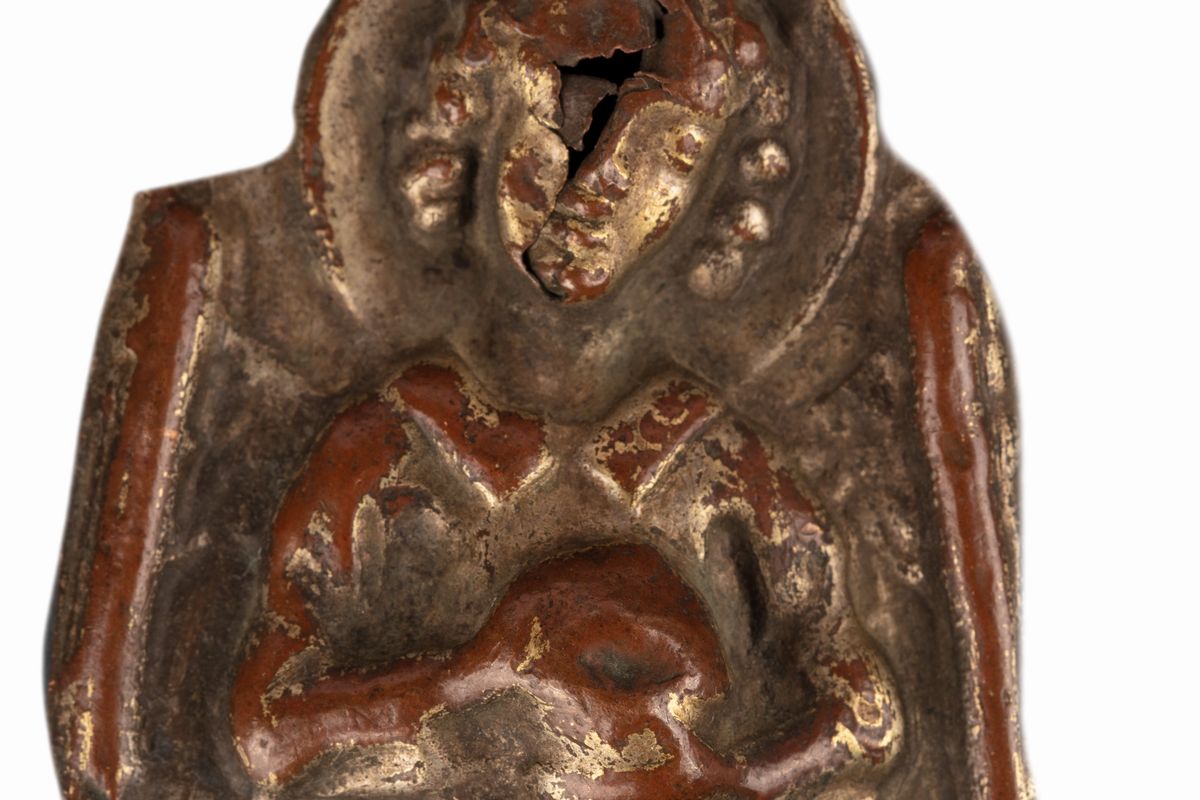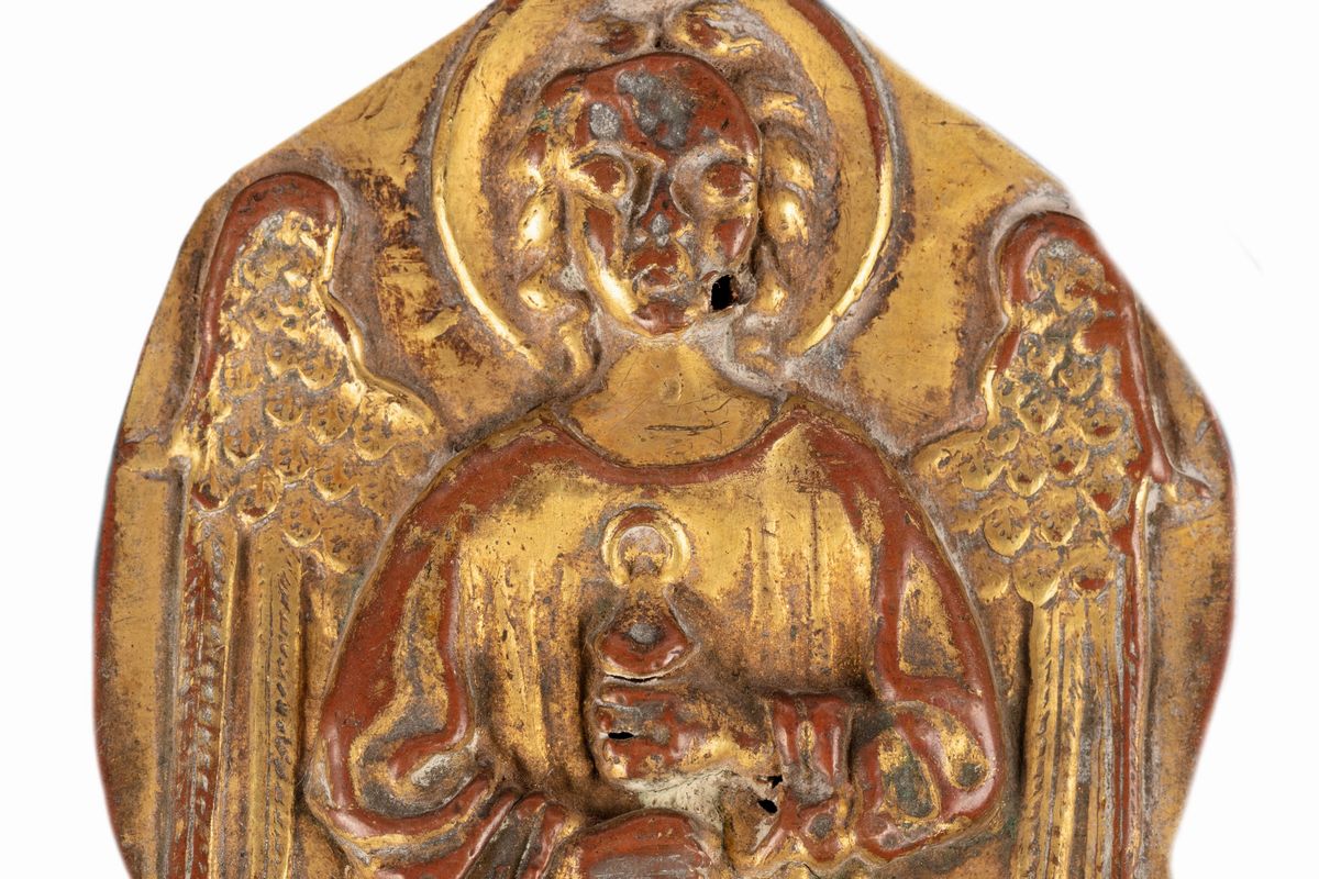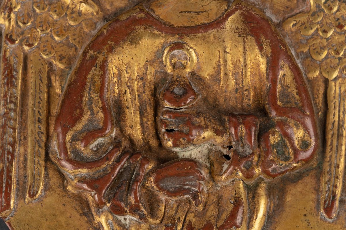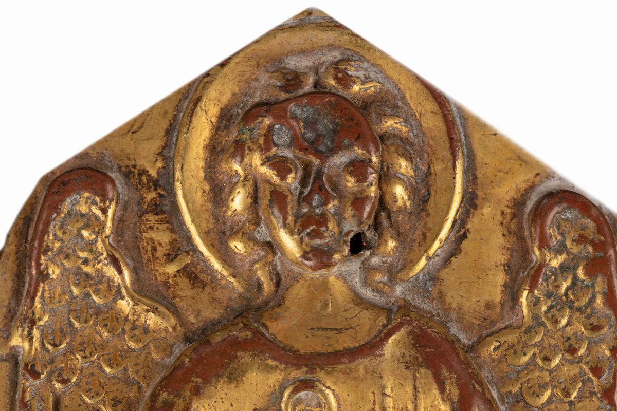 Lotto di sei finimenti per croci processionali in lamina di rame sbalzata, cesellata e dorata, secoli XIV - XV