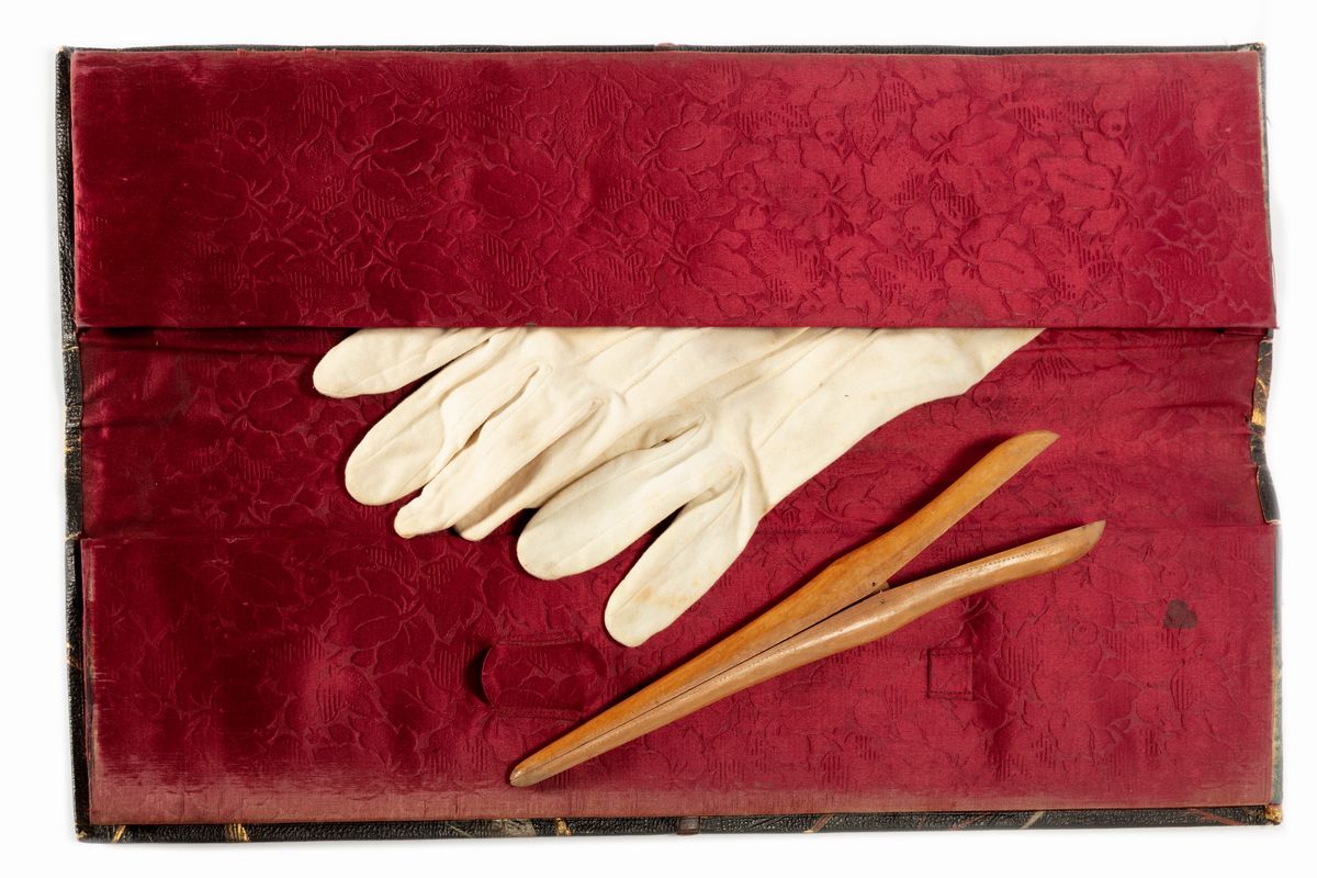 all'interno guanti bianchi in capretto e allarga dita in legno