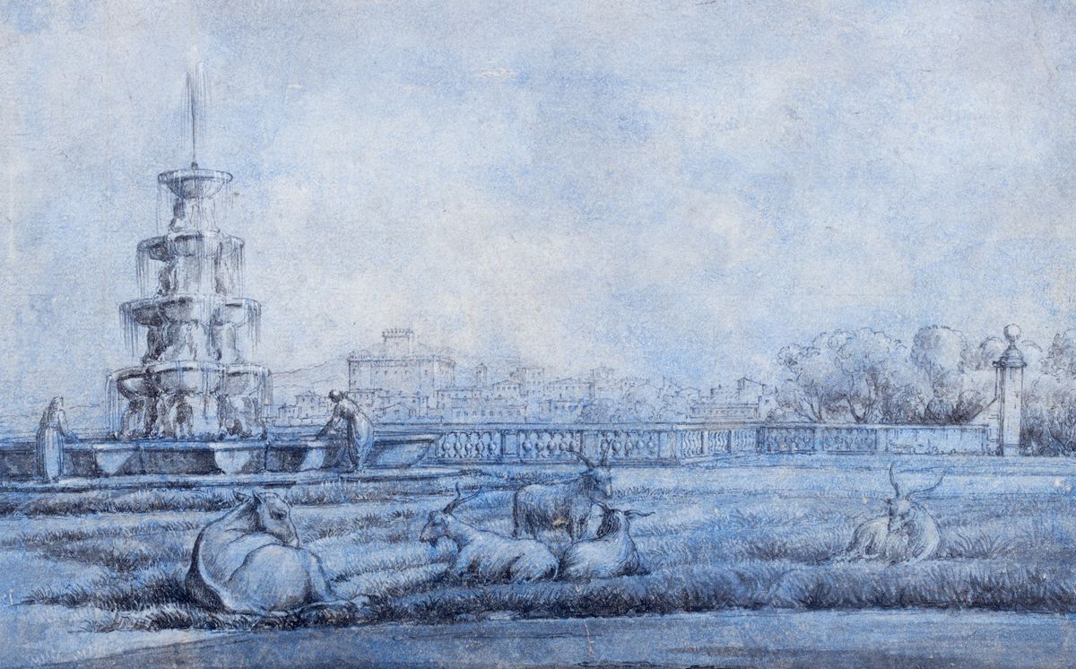 ed un altro disegno nel lotto raffigurante Paesaggio con fontana e armenti in primo piano e borgo turrito in lontananza, matita nera con rialzi di biacca su carta preparata azzurrina, mm 203 x 323