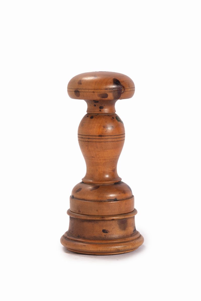 Sigillo in ferro, con custodia in legno tornito, raffigurante soldato appoggiato a uno stemma nobiliare, secoli XVII - XVIII