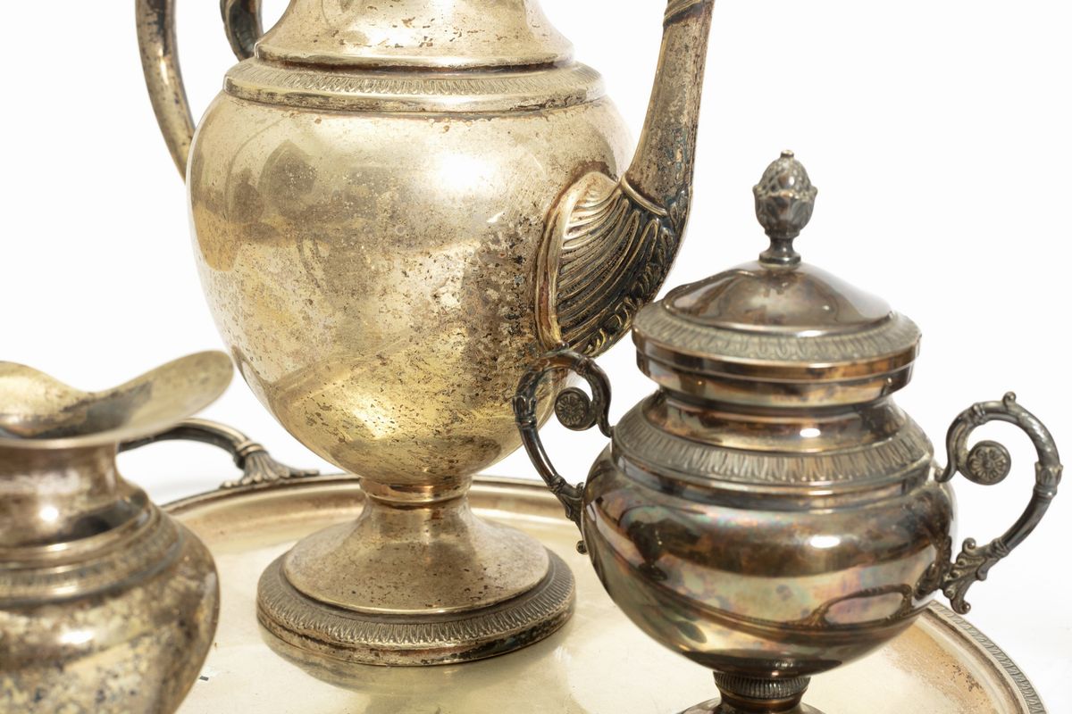 due caffettiere, una zuccheriera, una lattiera e un piccolo vassoio, tutti di fogge diverse