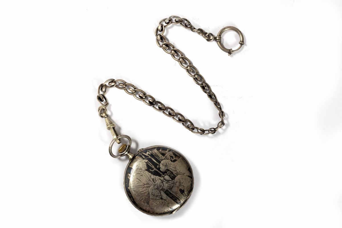 con cacciatore e cani sul retro; con catena