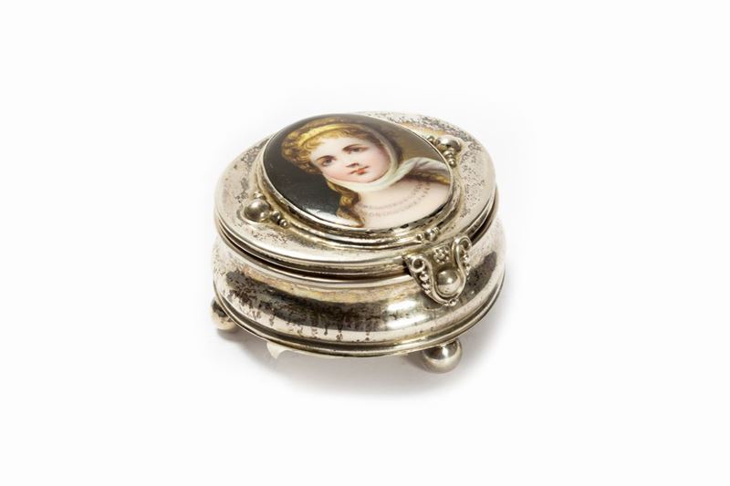 al centro medaglione in porcellana dipinta raffigurante ritratto femminile