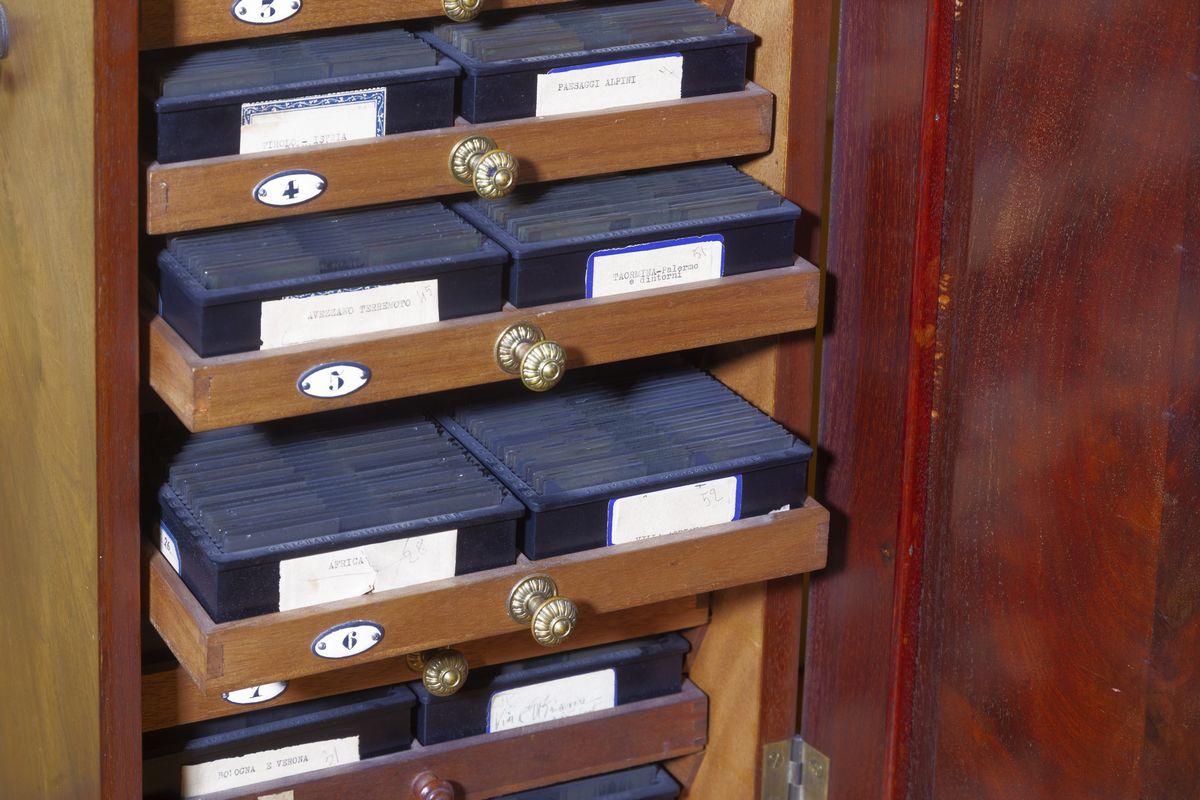 Il mobile contiene una ricca collezione di circa 600 vetrini fotografici riproducenti varie località italiane, europee, mediorientali e africane.