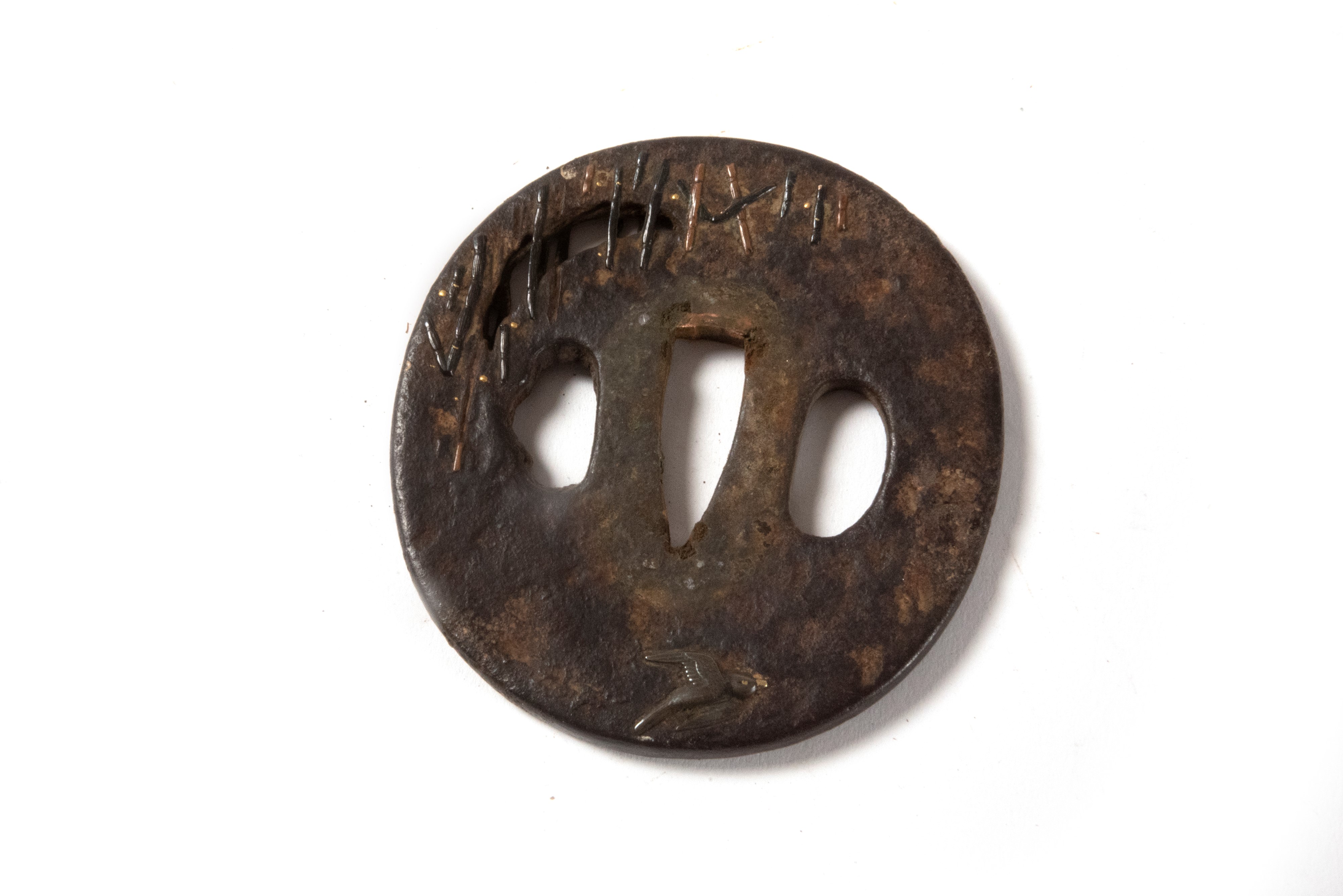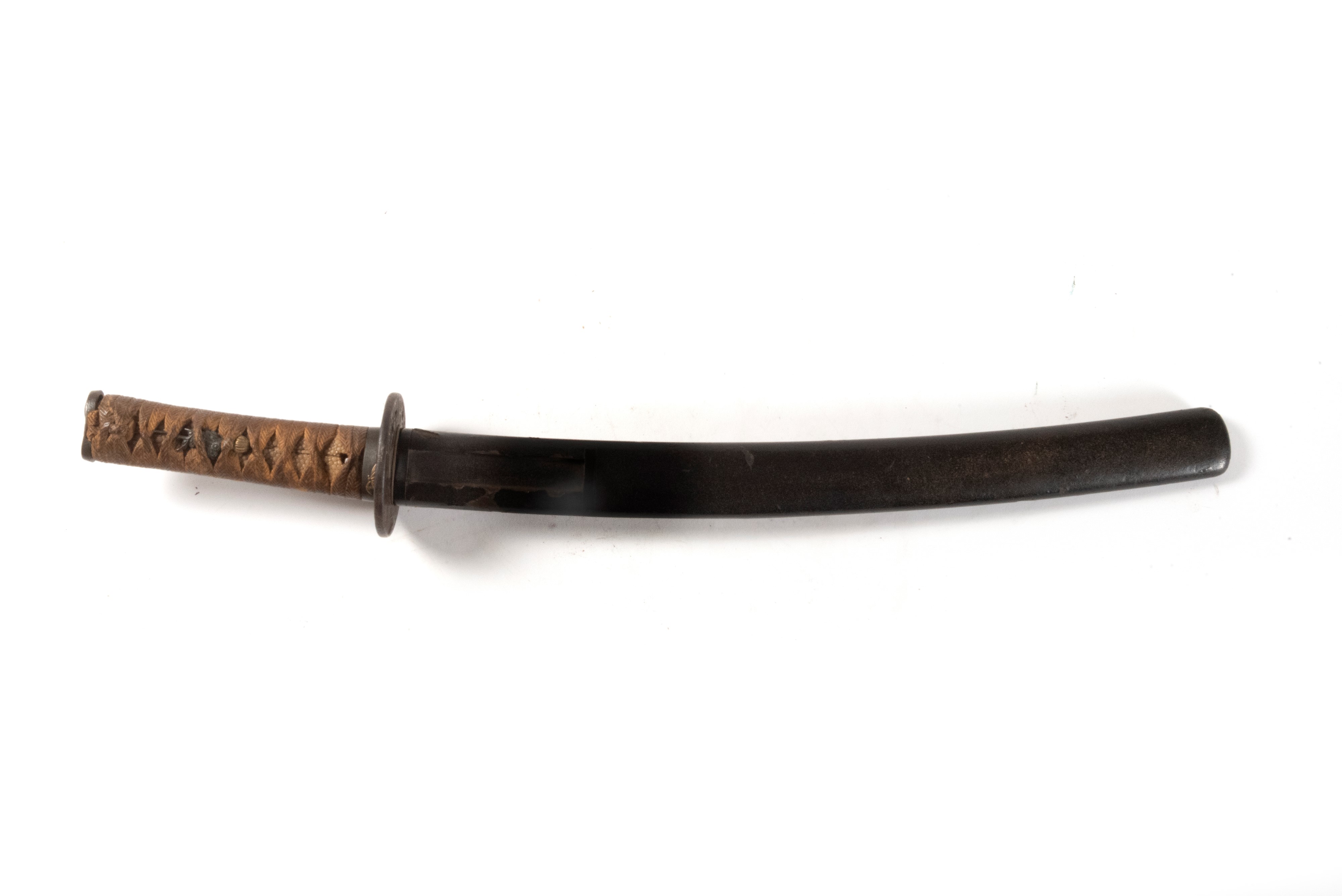 fodero in lacca nera, tsuba in ferro con applicazioni in shokudo, menuki in metallo dorato