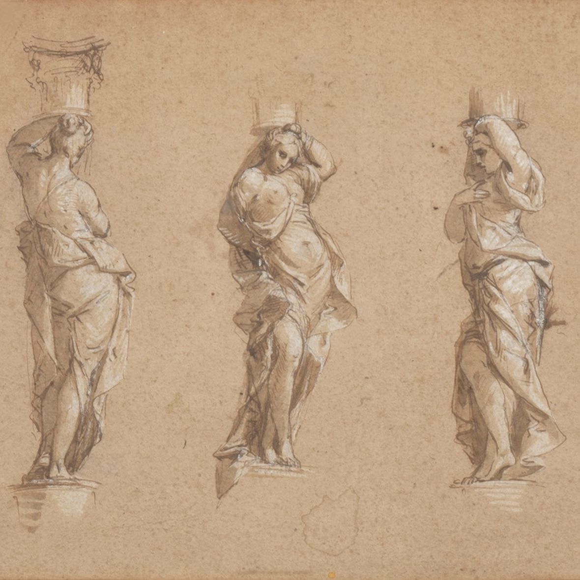penna e inchiostro bruno acquarellato con biacca su carta