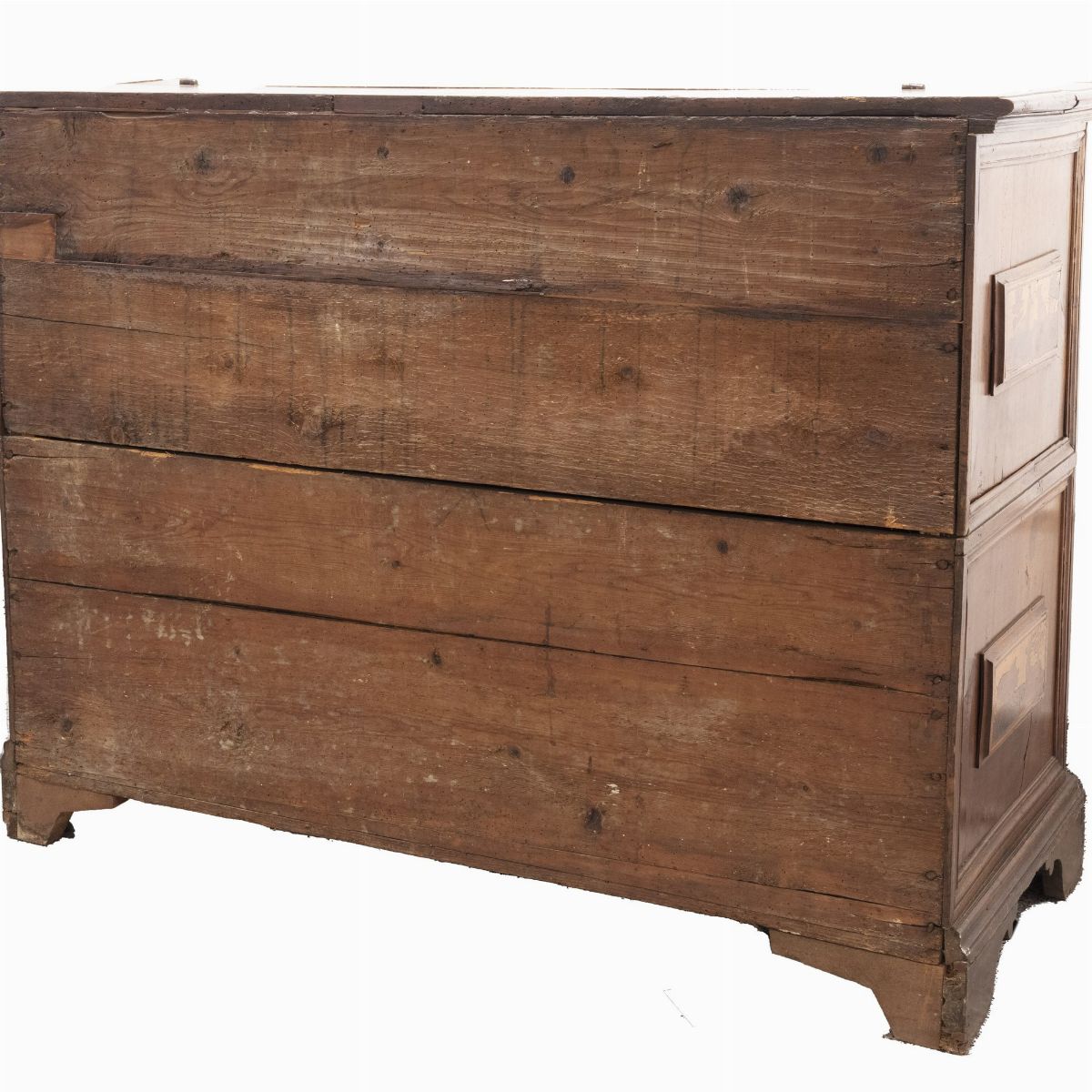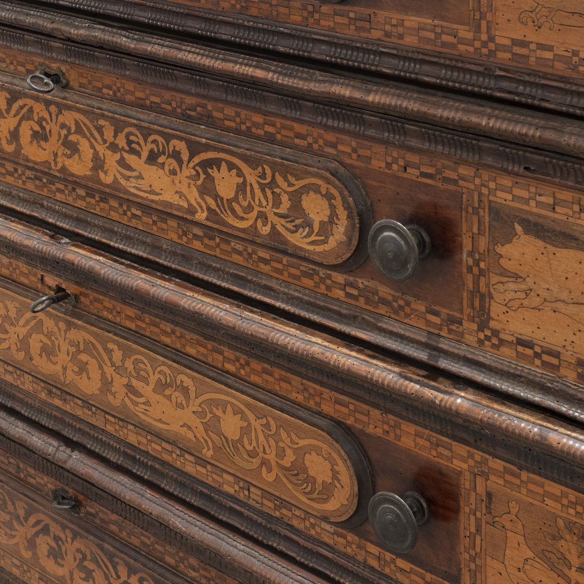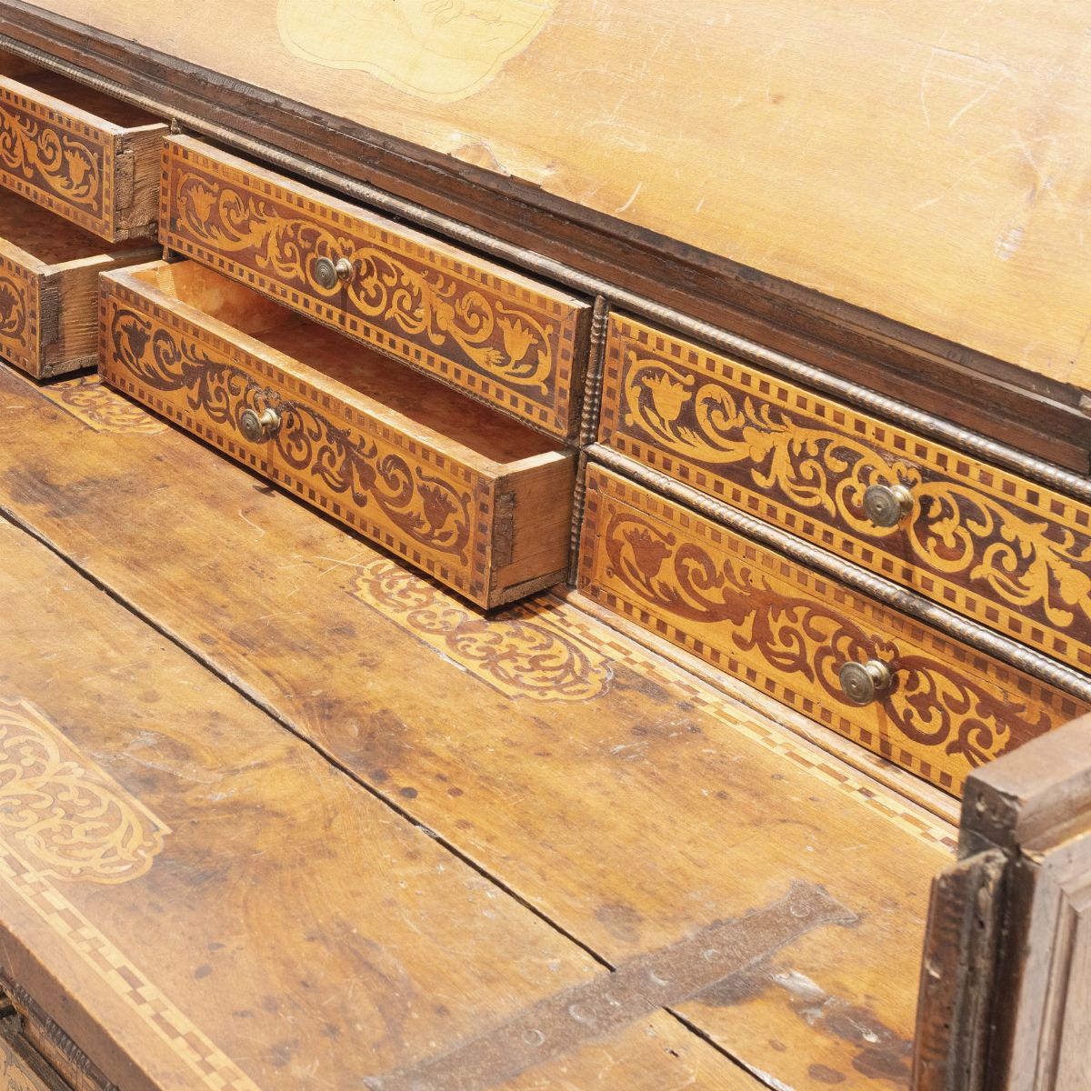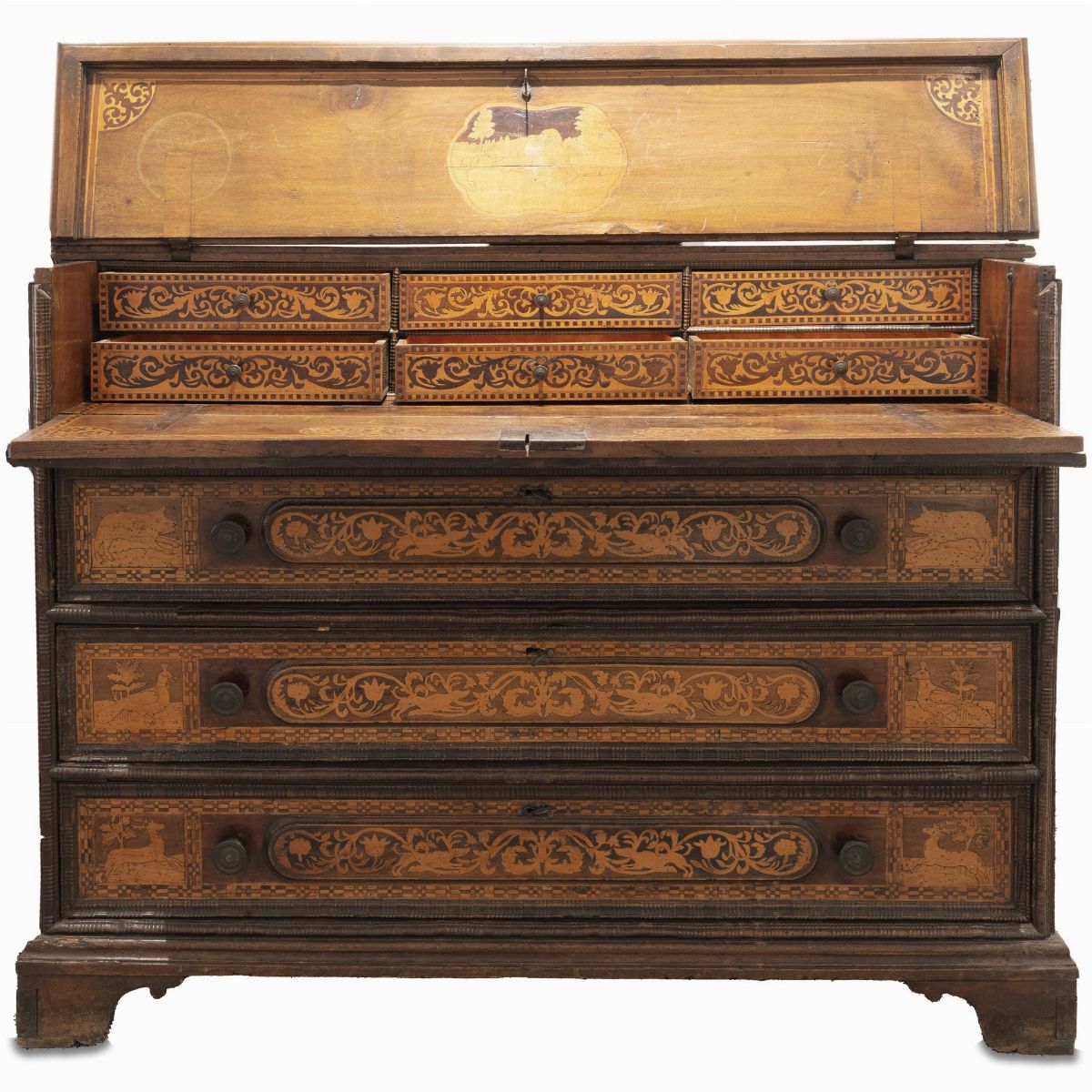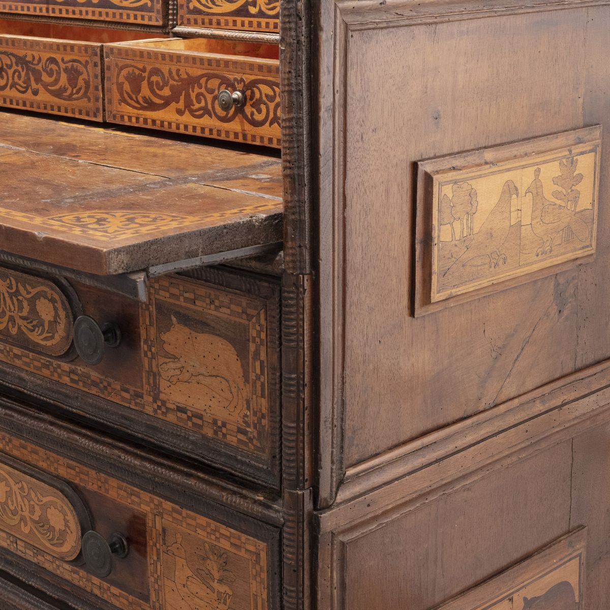 quattro cassettoni intarsiati con motivi vegetali e animali, di cui uno a ribalta con sei cassettini interni e tre a cassetto, fianchi decorati con formelle intarsiate e applicate, maniglie originali tornite in bronzo.
