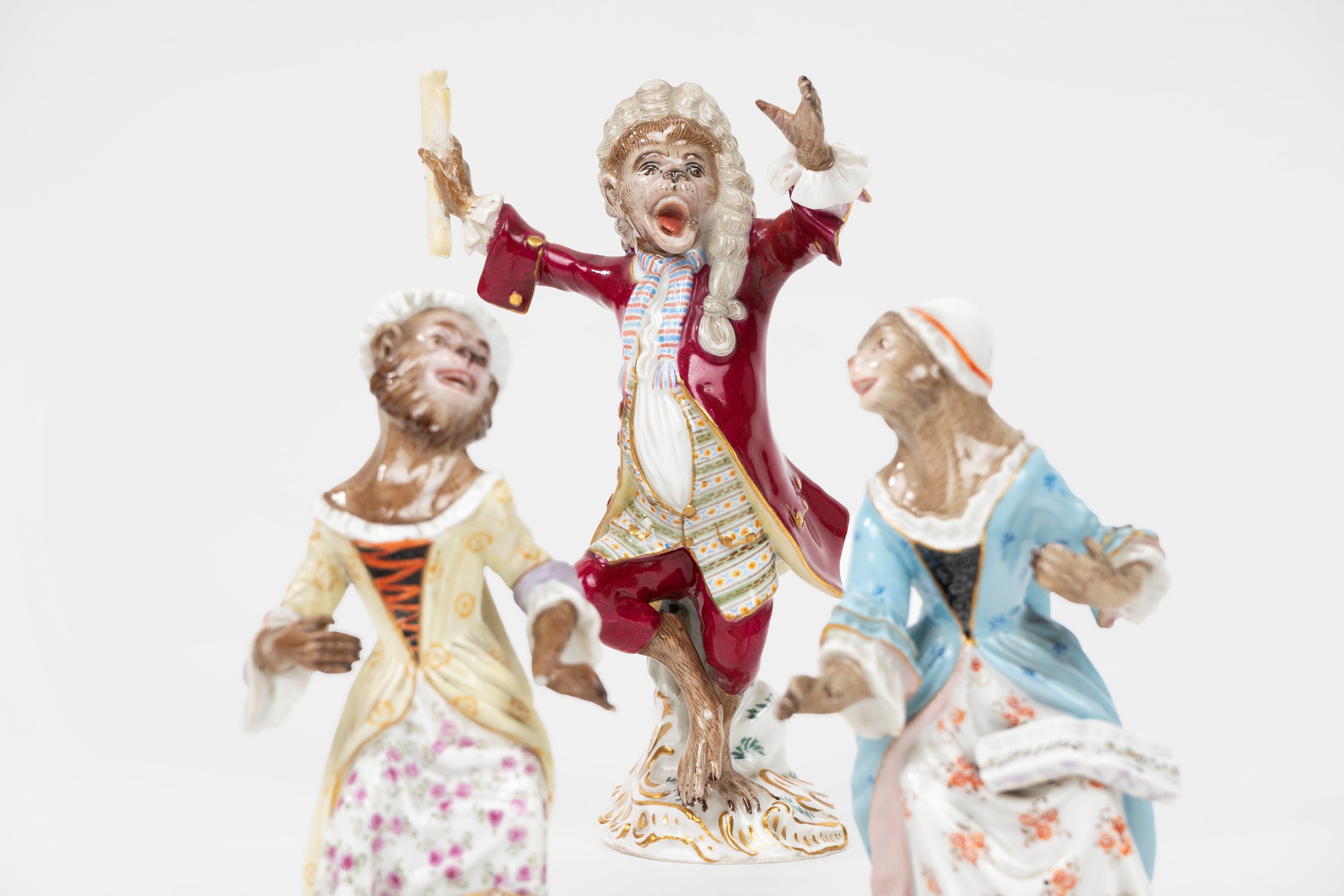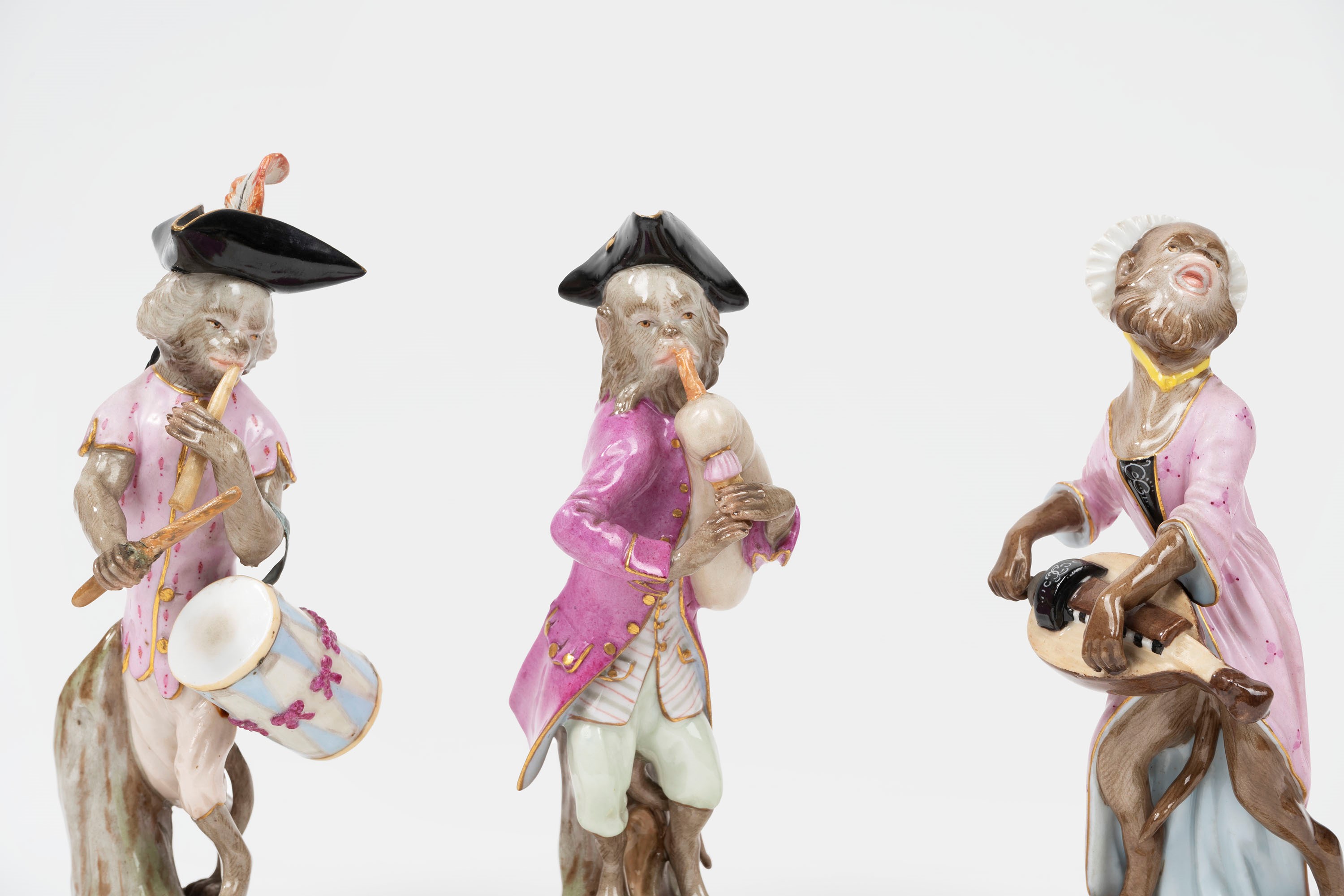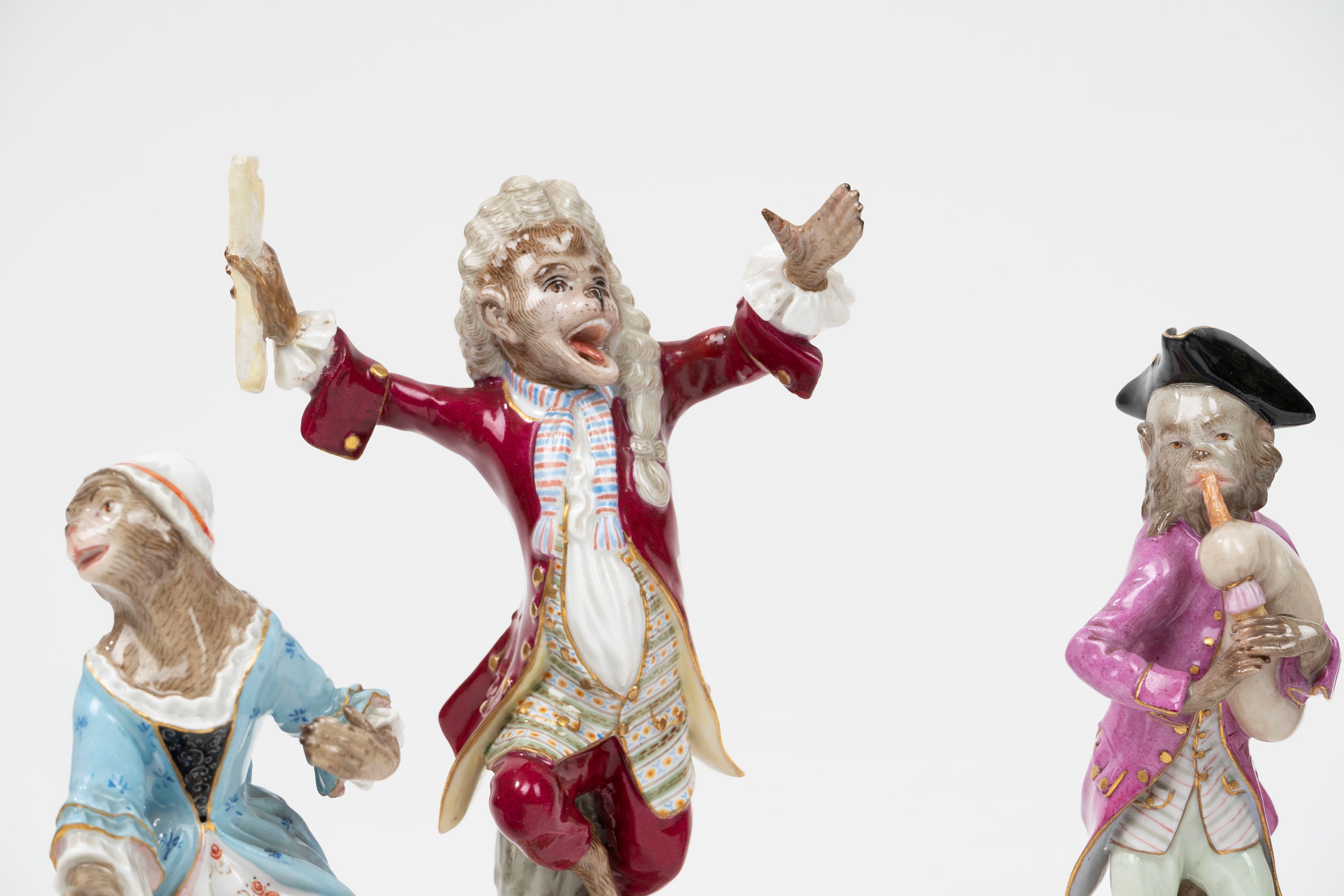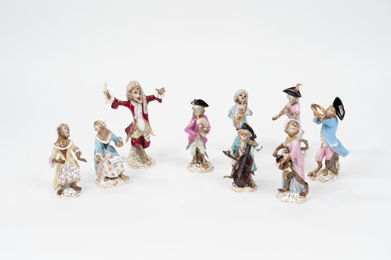 Concertino composto da nove sculture in porcellana policroma raffiguranti scimmie musicanti, manifattura di Meissen, secolo XIX