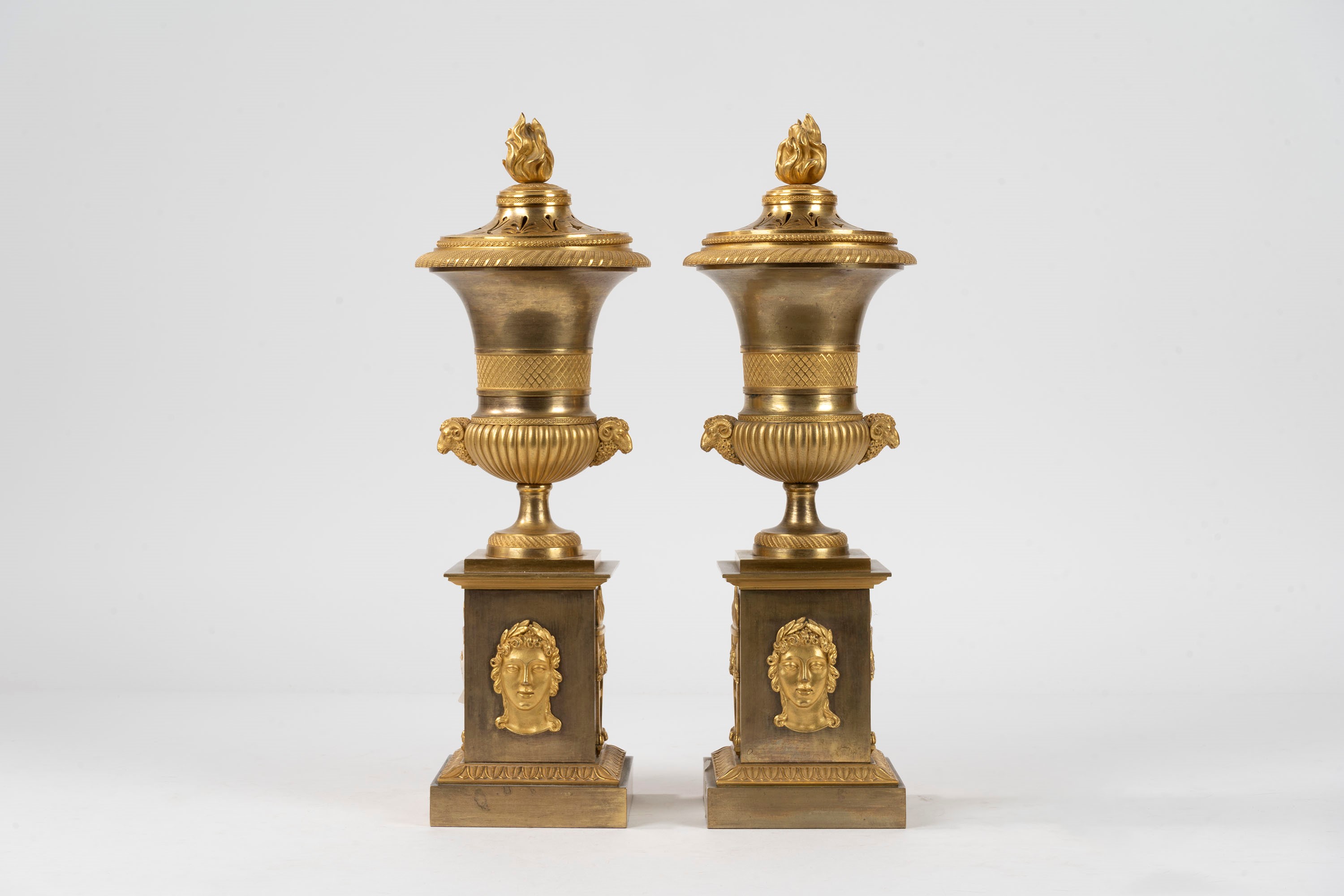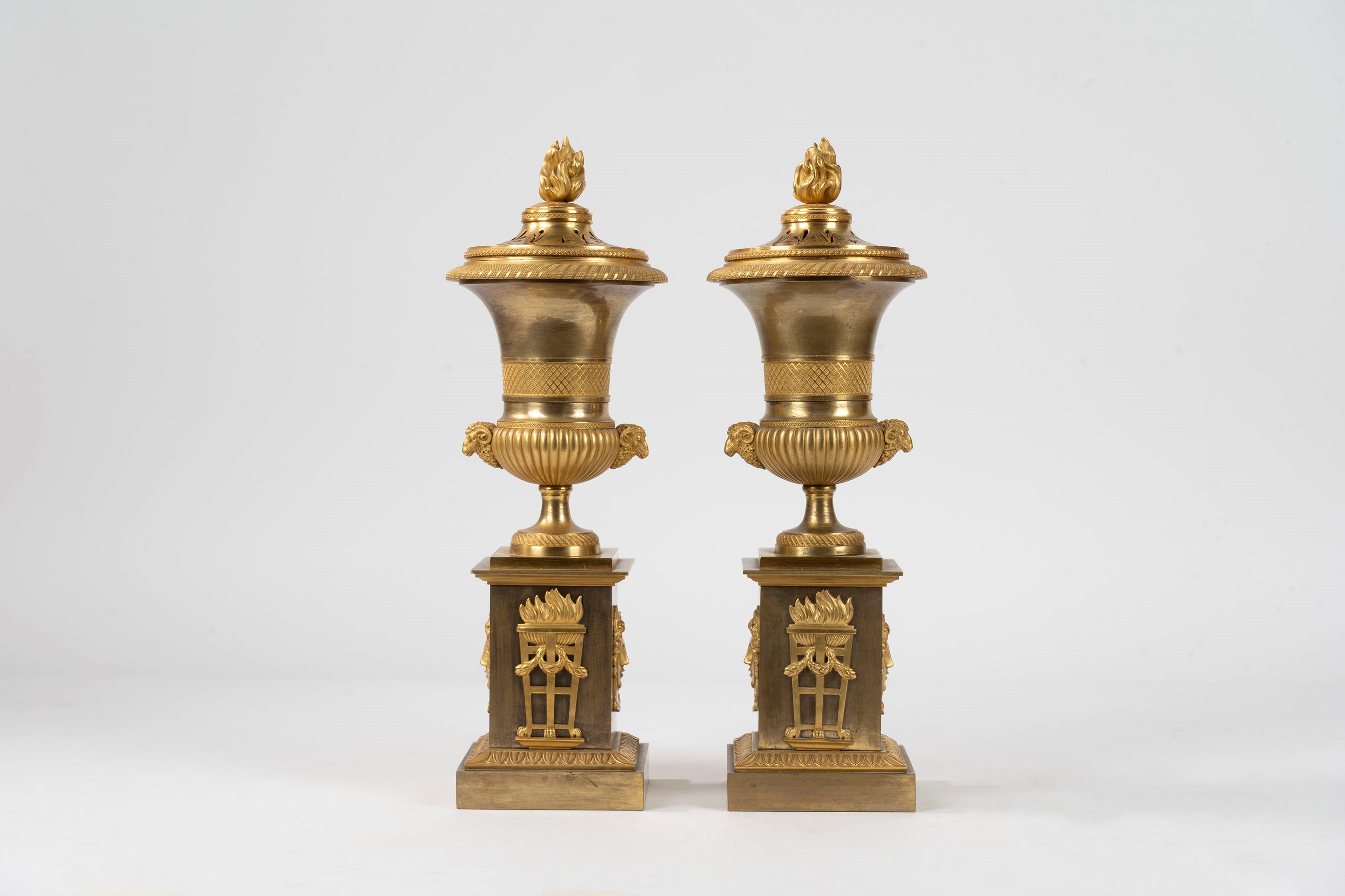reversible lid with candle holder, two ram heads on the podded body, base decorated with heads and braziers