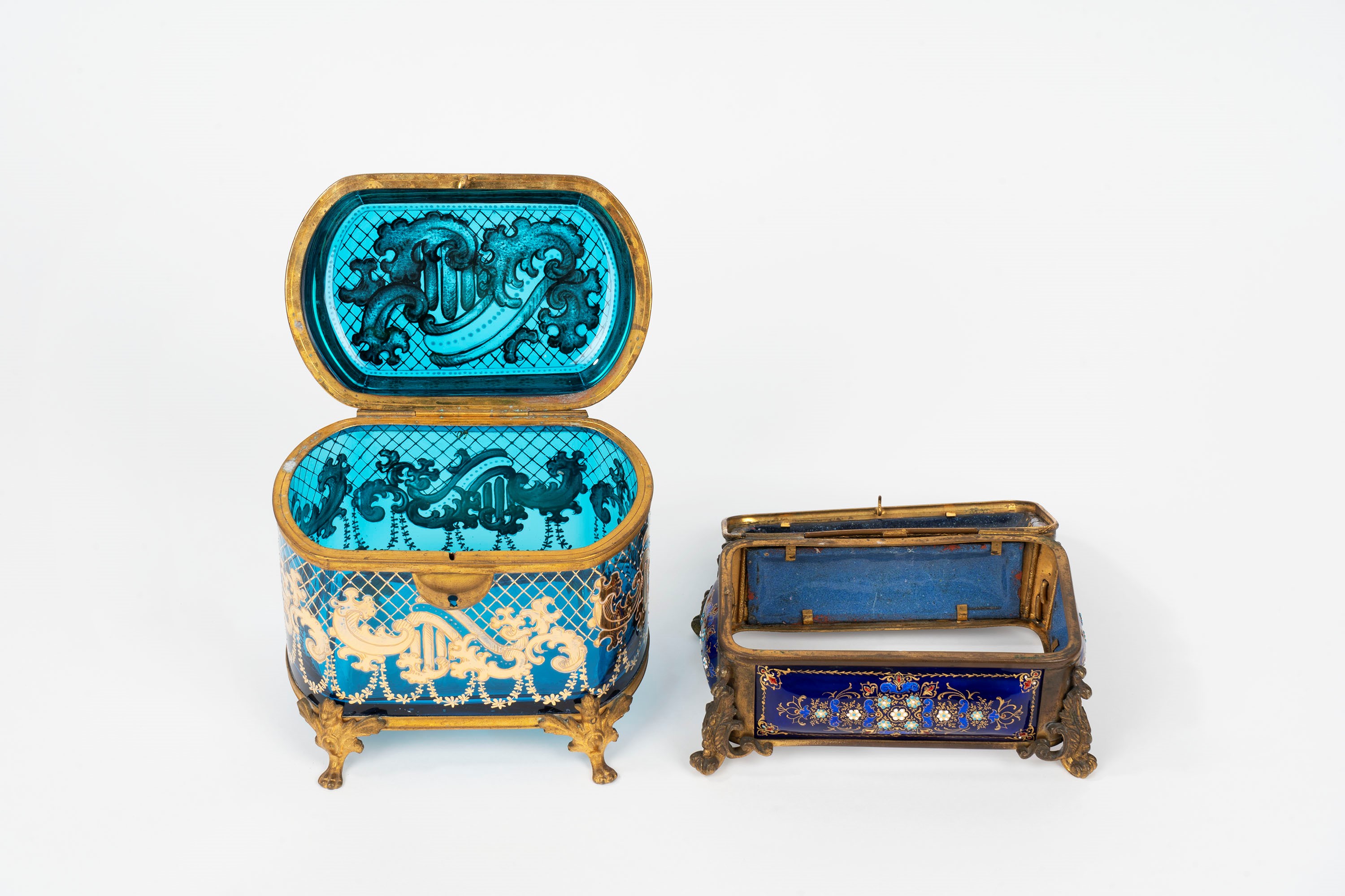 uno in bronzo dorato e cristallo con decorazioni in oro zecchino; uno in bronzo e smalti di Limoges, difetti e mancanze