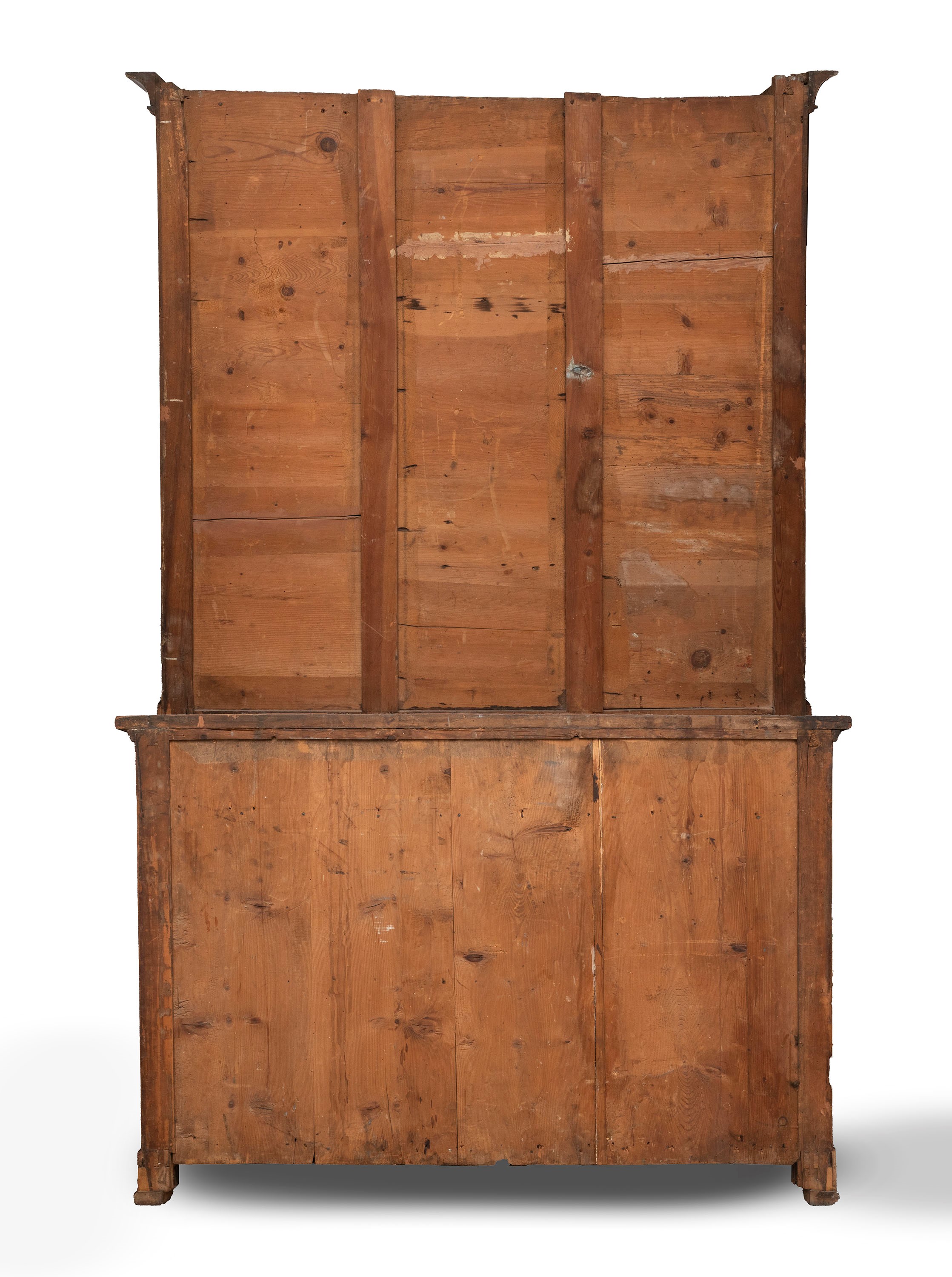 corpo inferiore con due sportelli centrali e cassetto sotto il piano, corpo superiore a vetrina, entrambi con lesene terminanti con capitelli a forma di cariatidi e basi a zampe ferine, fregio con motivi vegetali al centro (le decorazione sono in legno intagliato e dorato);