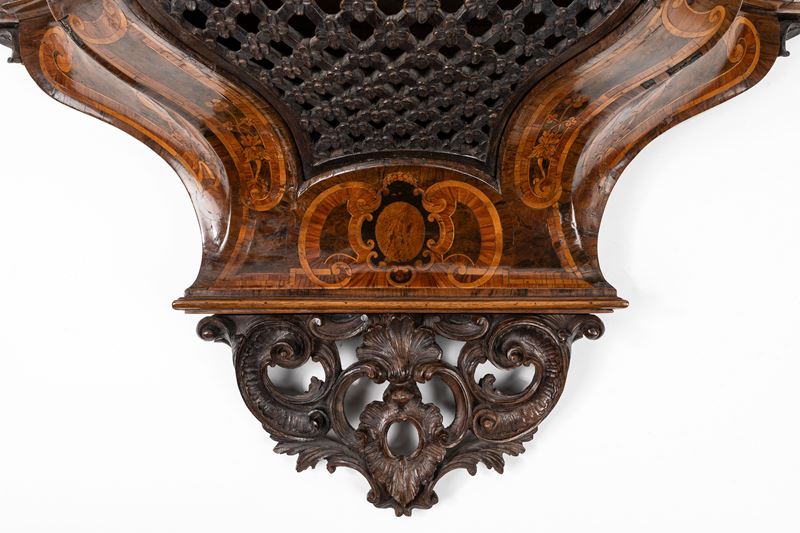 Importante piccola consolle da muro in legno intagliato e intarsiato, con motivi a rocaille, secolo XVIII