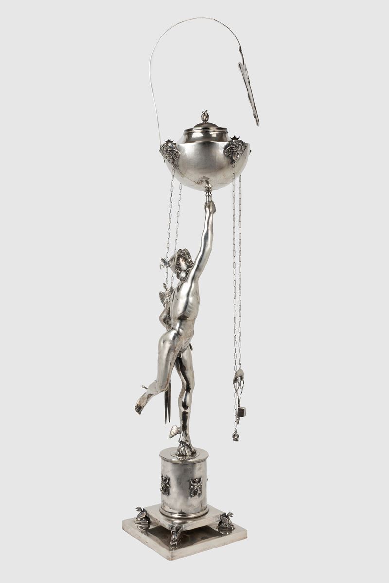 lanterna con ventola, decorata con teste di Medusa, base cilindrica con teste di toro, poggiante su base con piedini a forma di grifoni