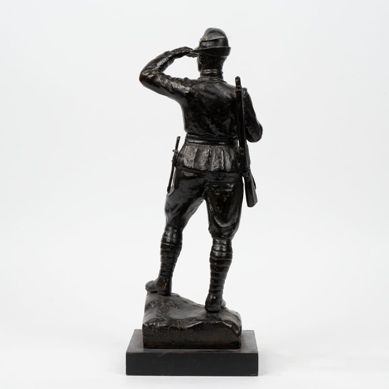 Scultura in bronzo a patina scura raffigurante militare della Guardia di Finanza, inizi secolo XX