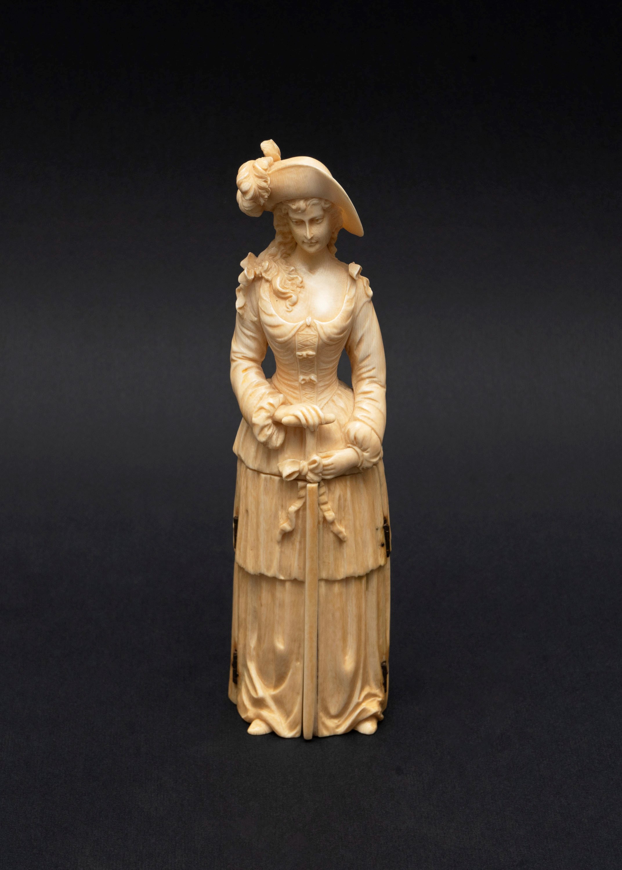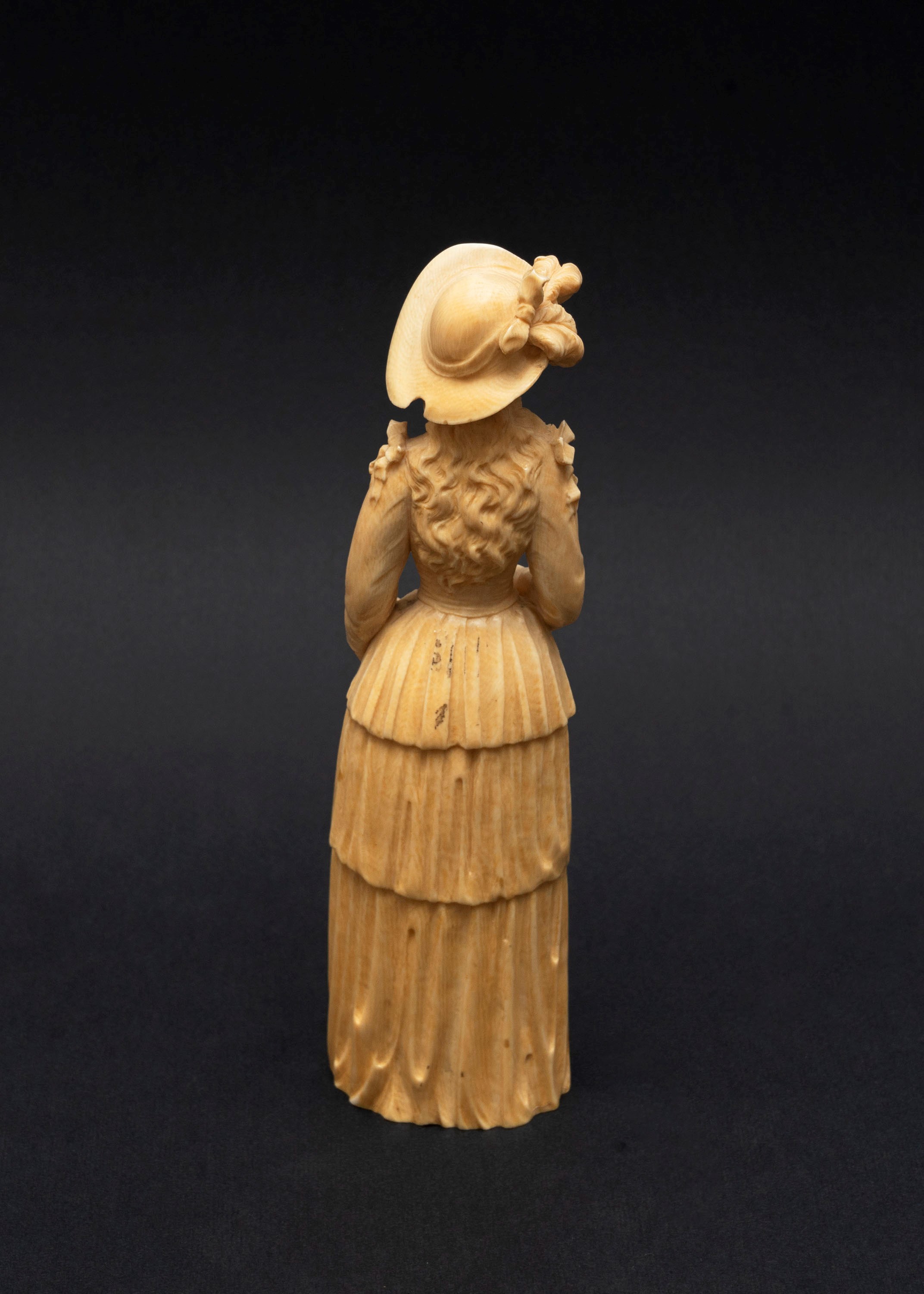 ☼ Scultura in avorio raffigurante nobildonna con cappello piumato, manifattura di Dieppe