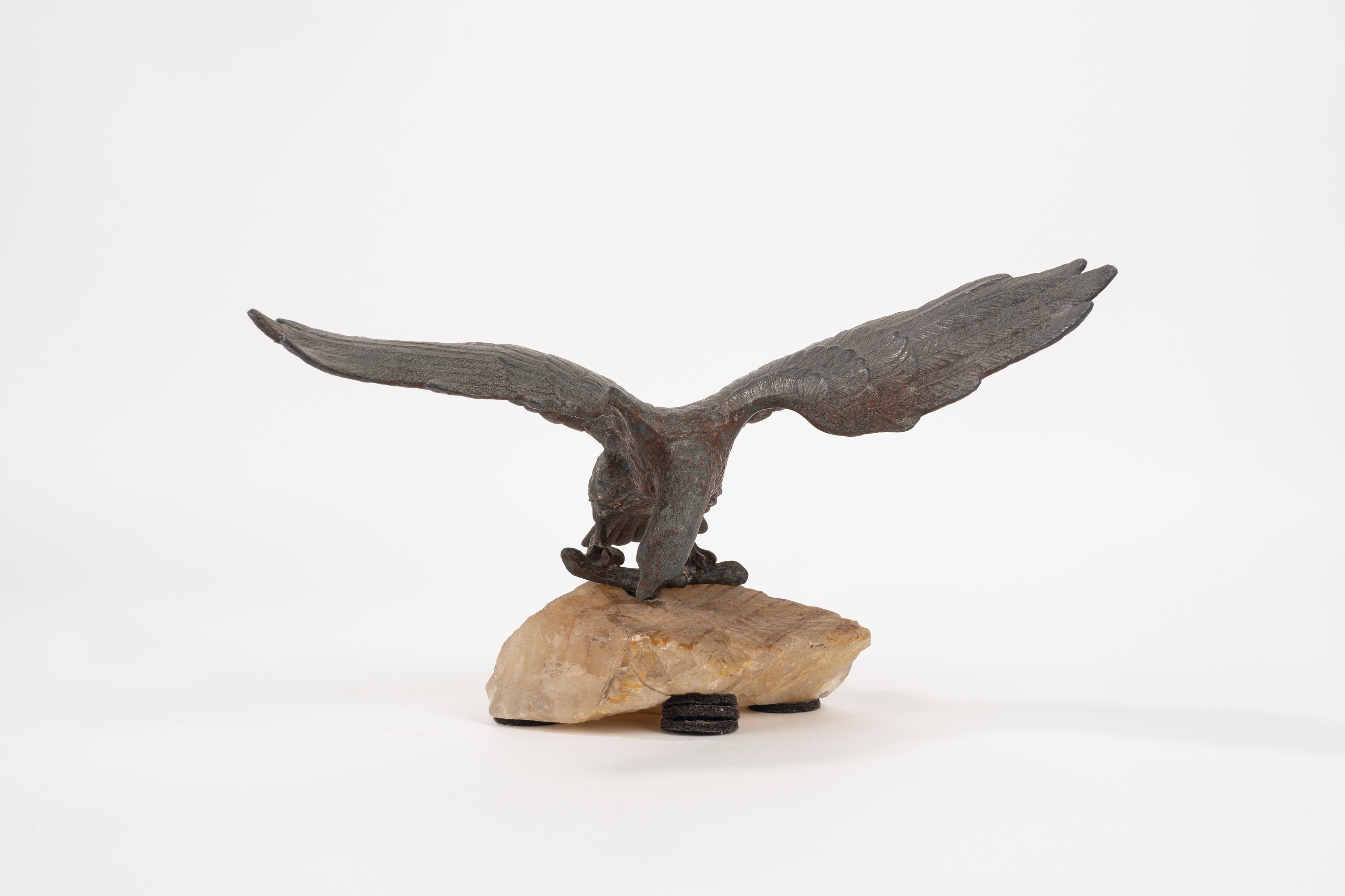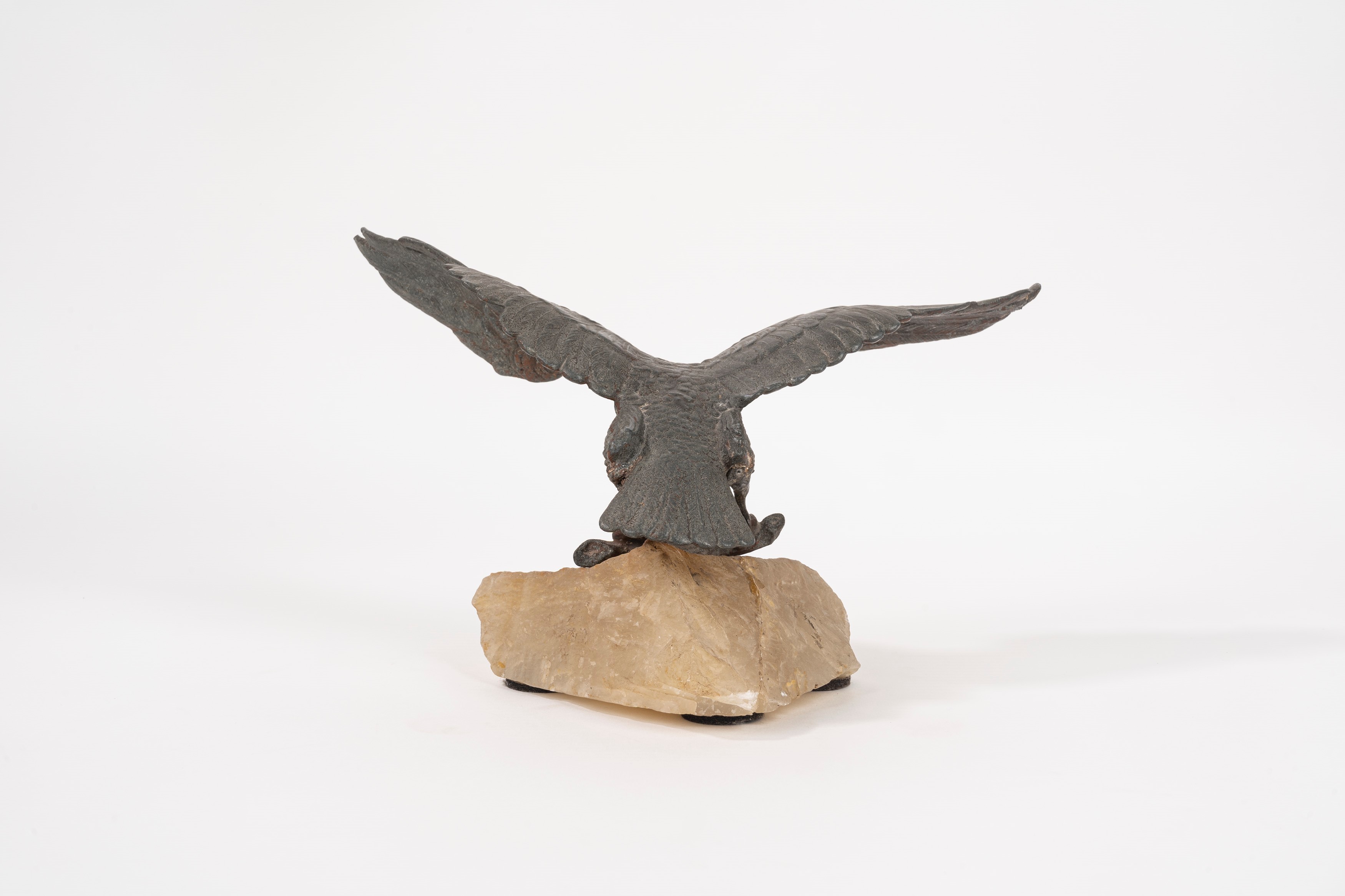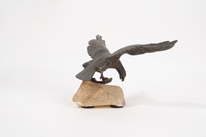 scultura in bronzo a patina scura su base in travertino
