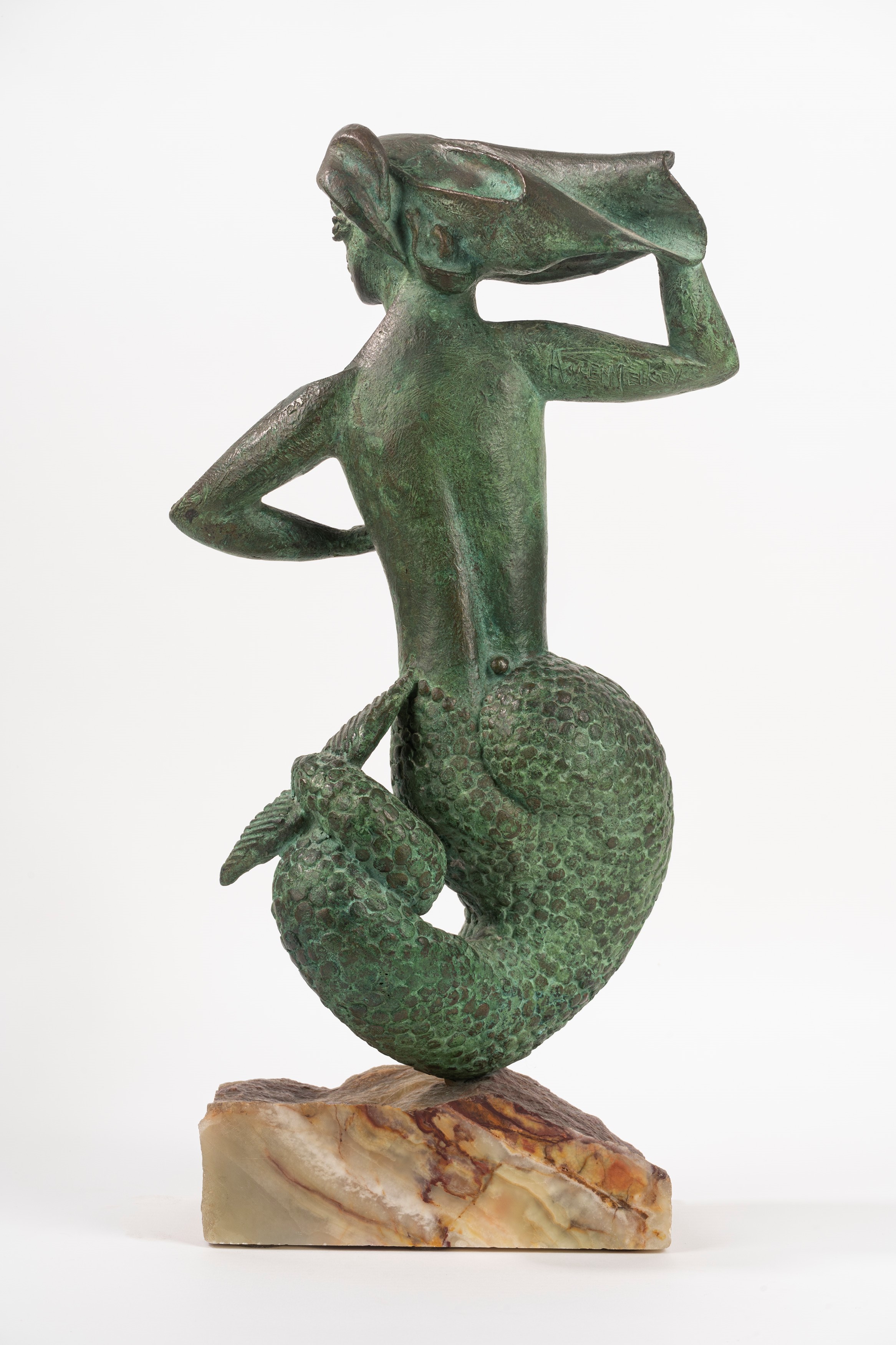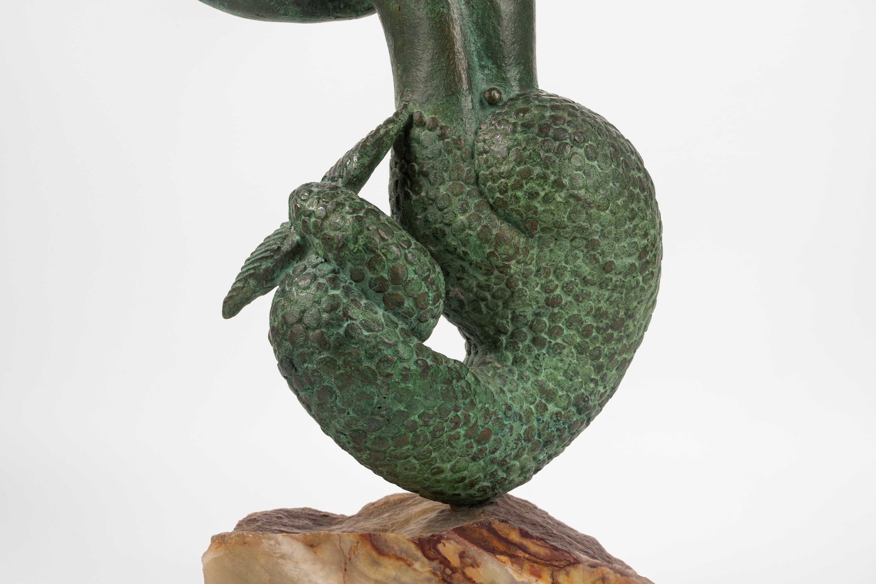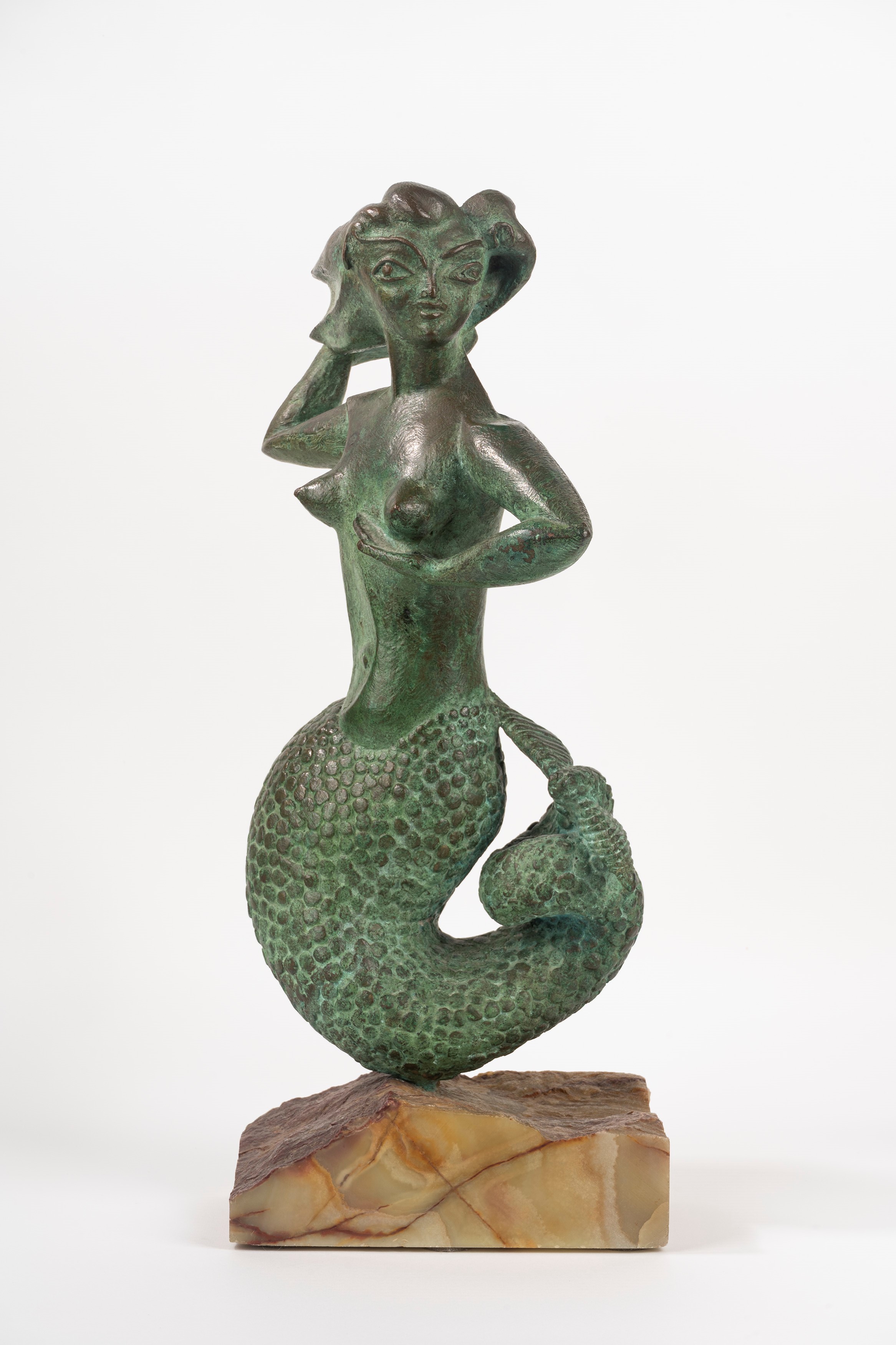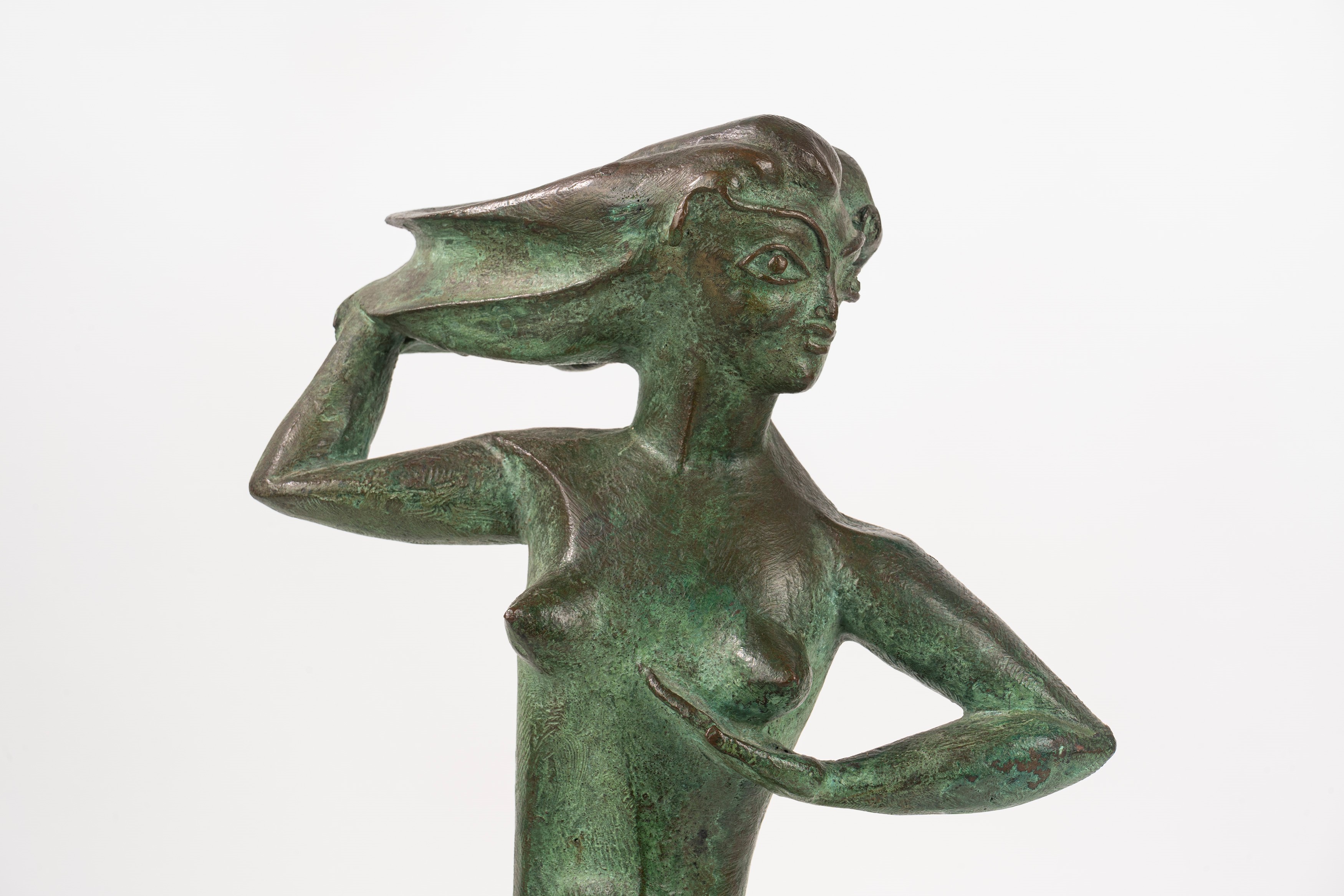 scultura in bronzo a patina verde su base in marmo
